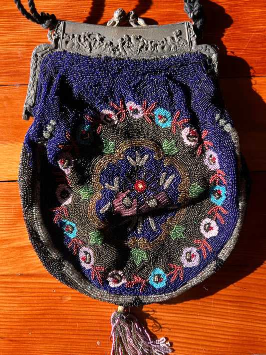 Large Antique Micro Bead Purse with Silver Repousse Frame