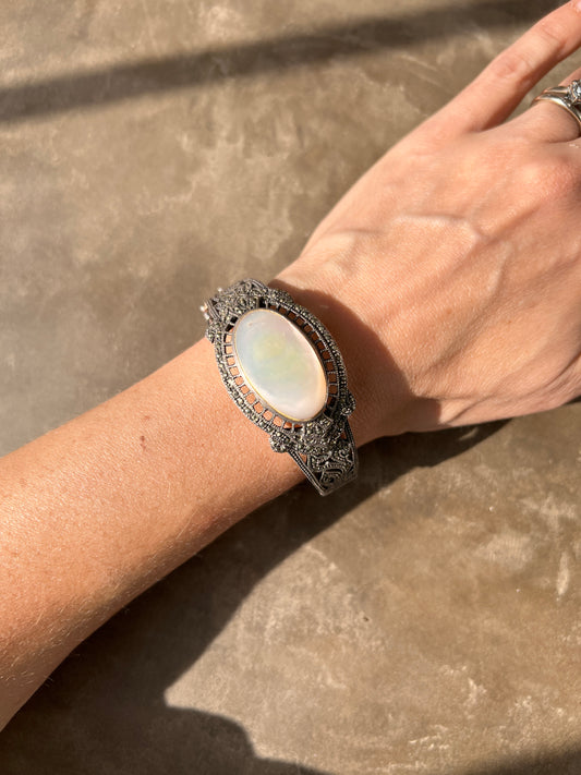 Art Deco Sterling Marcasite and Mother of Pearl Hinged Bracelet