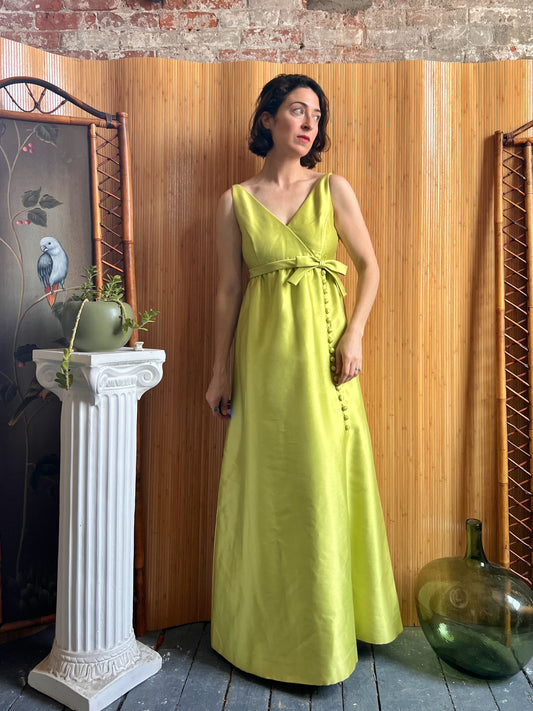1960s Dupioni Silk Column Dress w Ruffle Neck & Bow XS