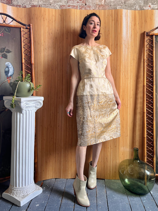 1950s Frank Starr Silk & Gold Thread Shift Dress M/L