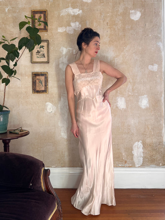 1940s Pink Rayon & Lace Grecian Bias Cut Gown S/M