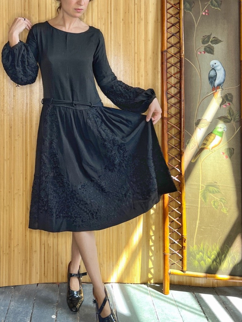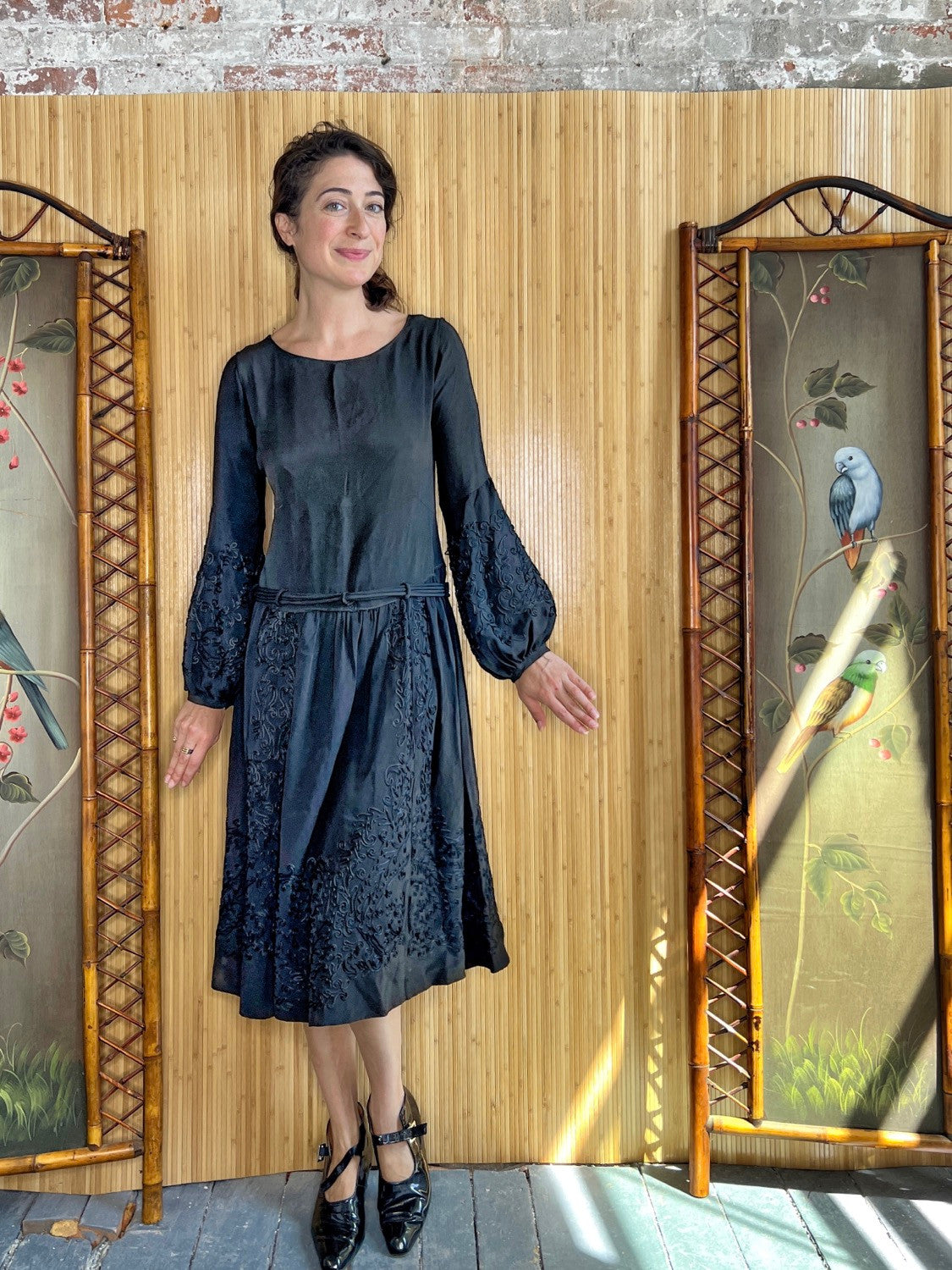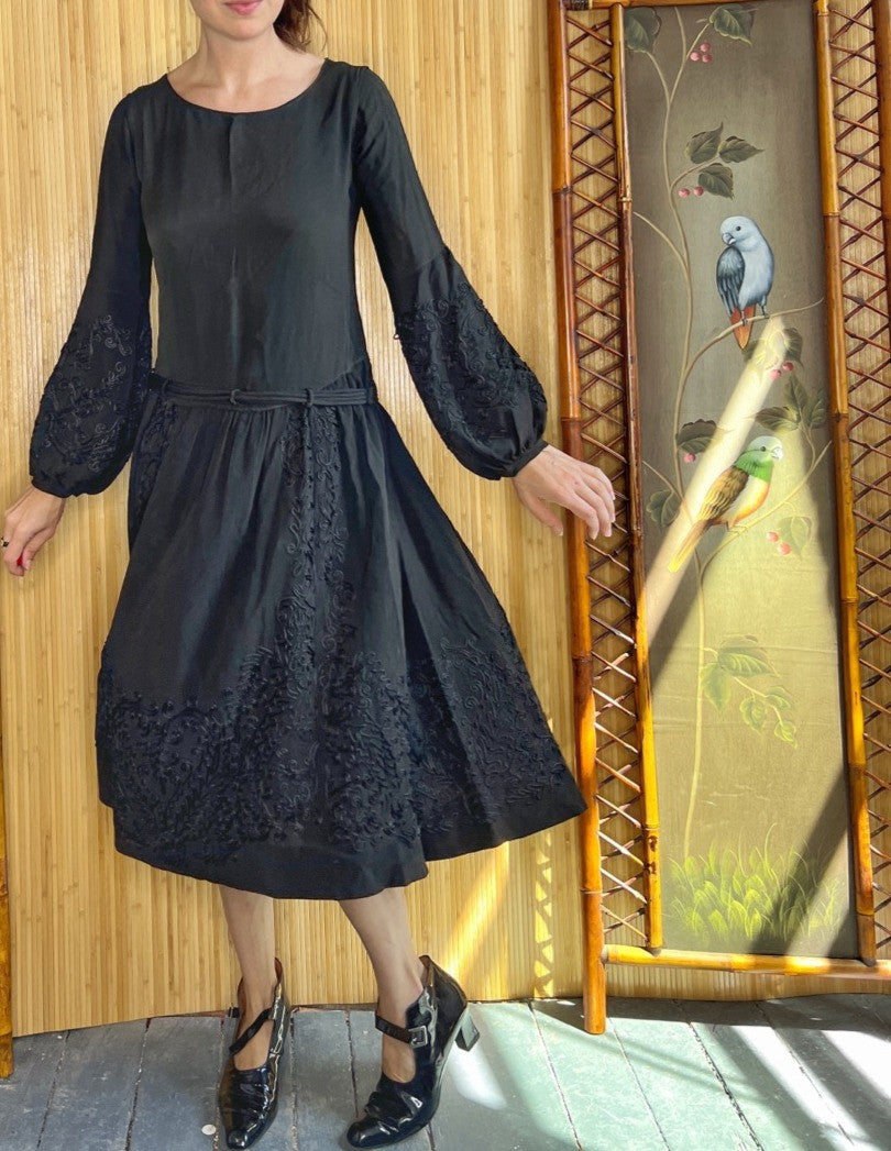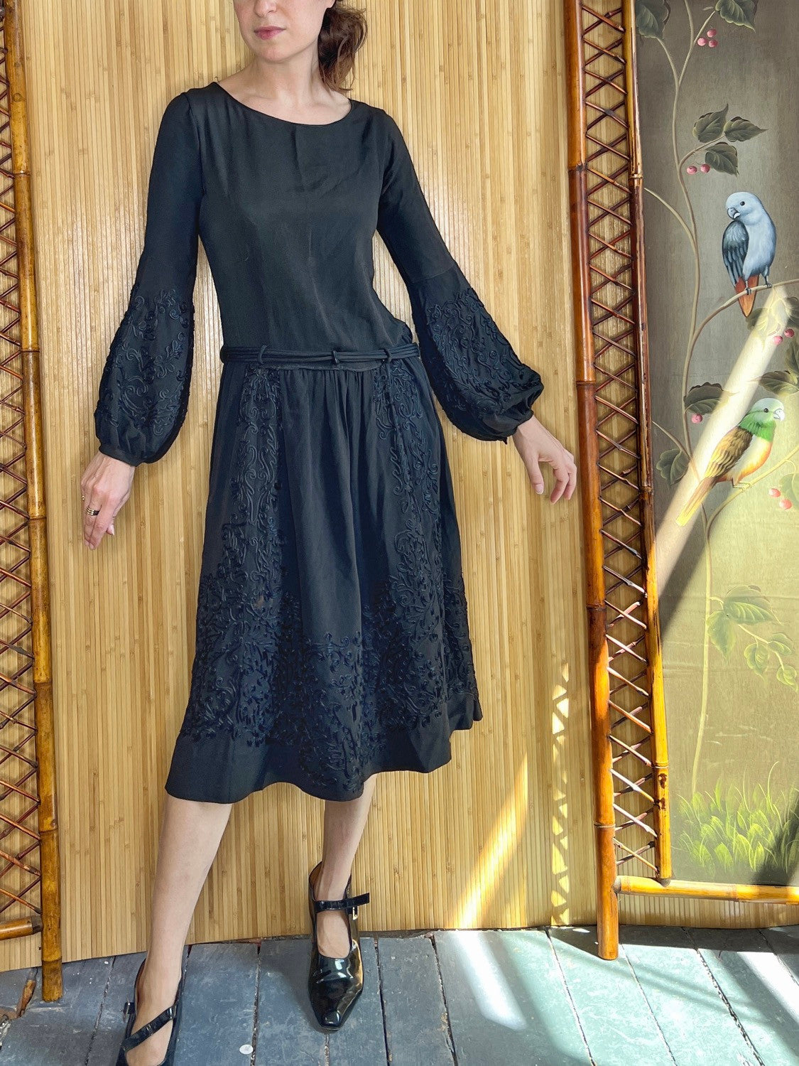 1920s/30s Drop-Waist Bishop Sleeve Dress w/ Soutache M