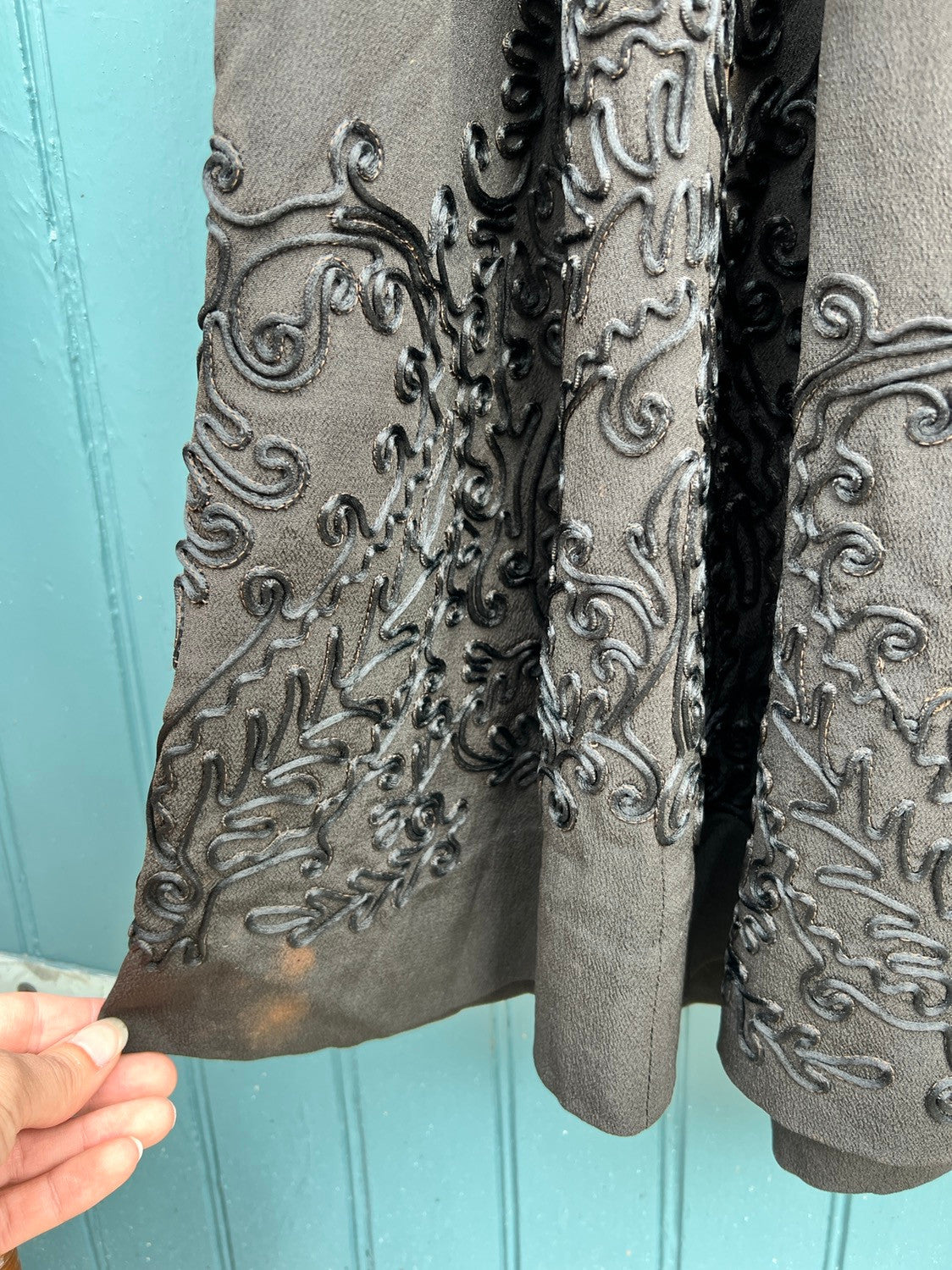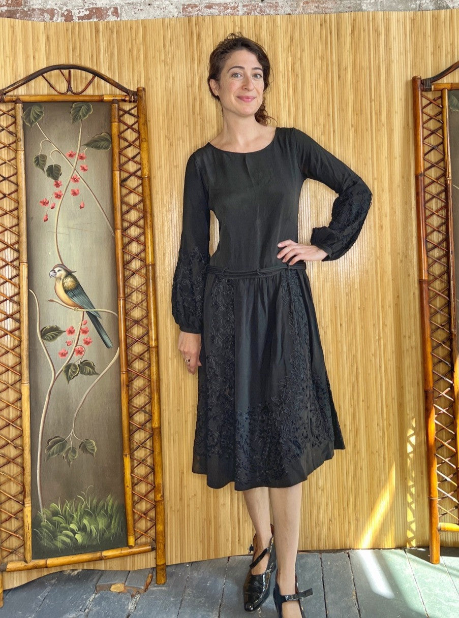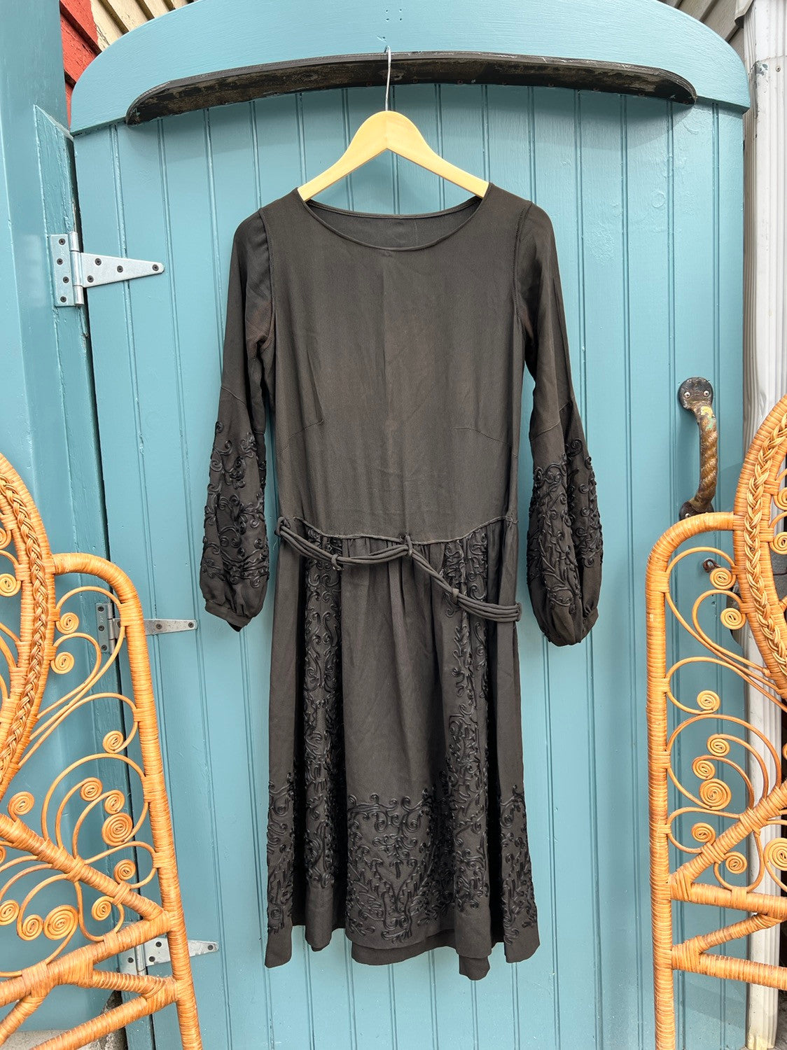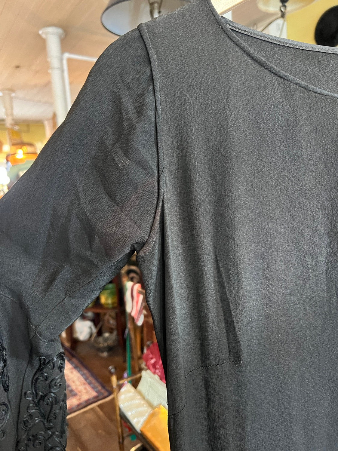 1920s/30s Drop-Waist Bishop Sleeve Dress w/ Soutache M