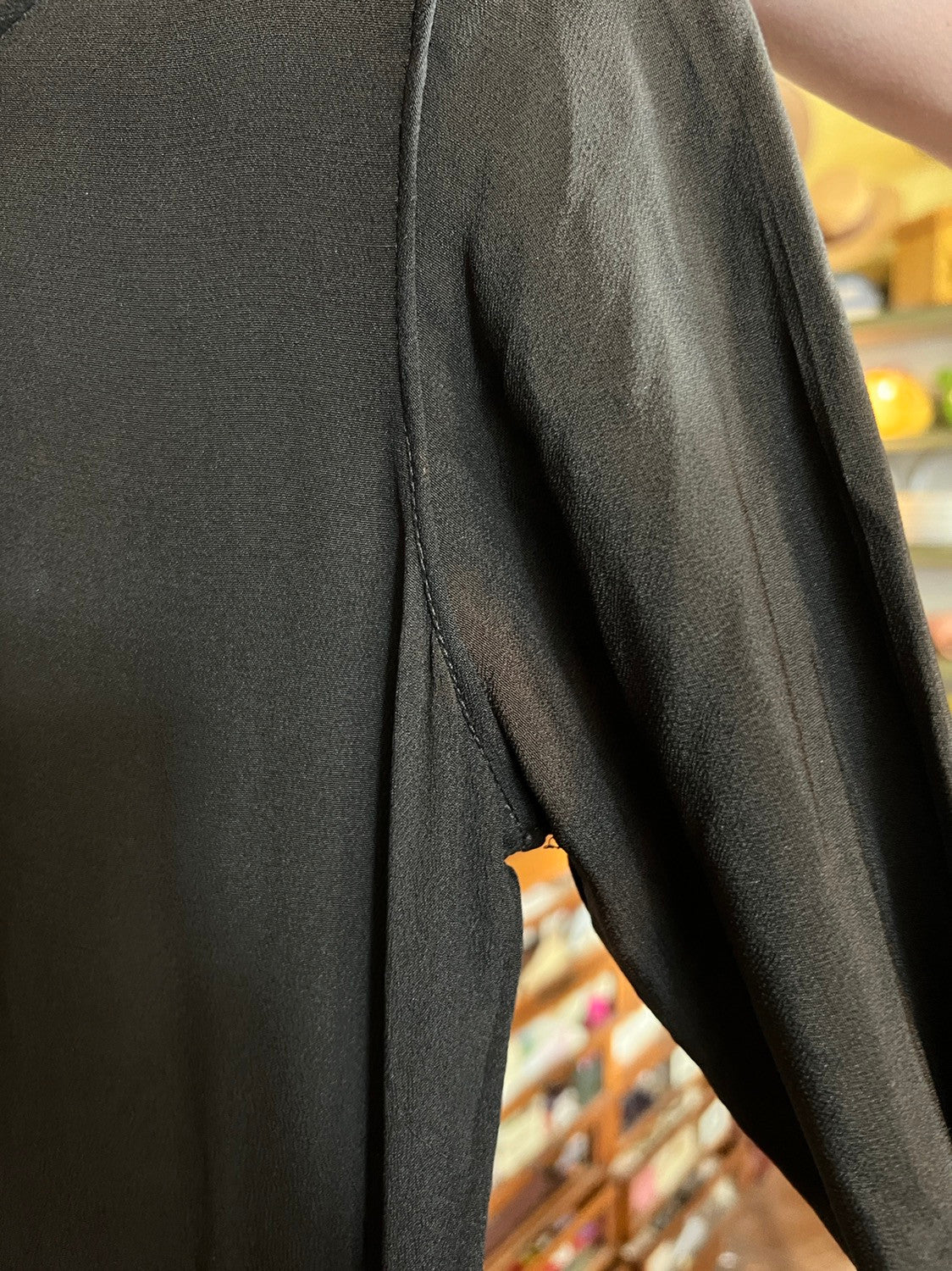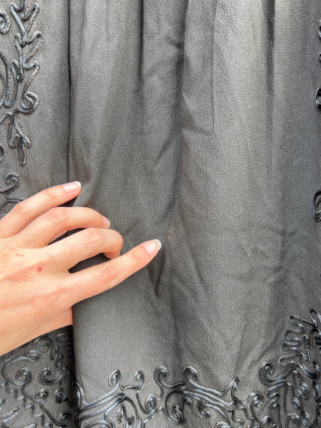 Amazing late 20s/early 30s drop waist dress with dramatic pieced bishop sleeves and braided soutache detail throughout. Dress feels like a silk crepe-- has nice movement and drape. Multi-strand belt at drop waist. 1920s silhouette with iconic 1930s sleeves makes me think early 30s... either way, a pretty timeless piece :)