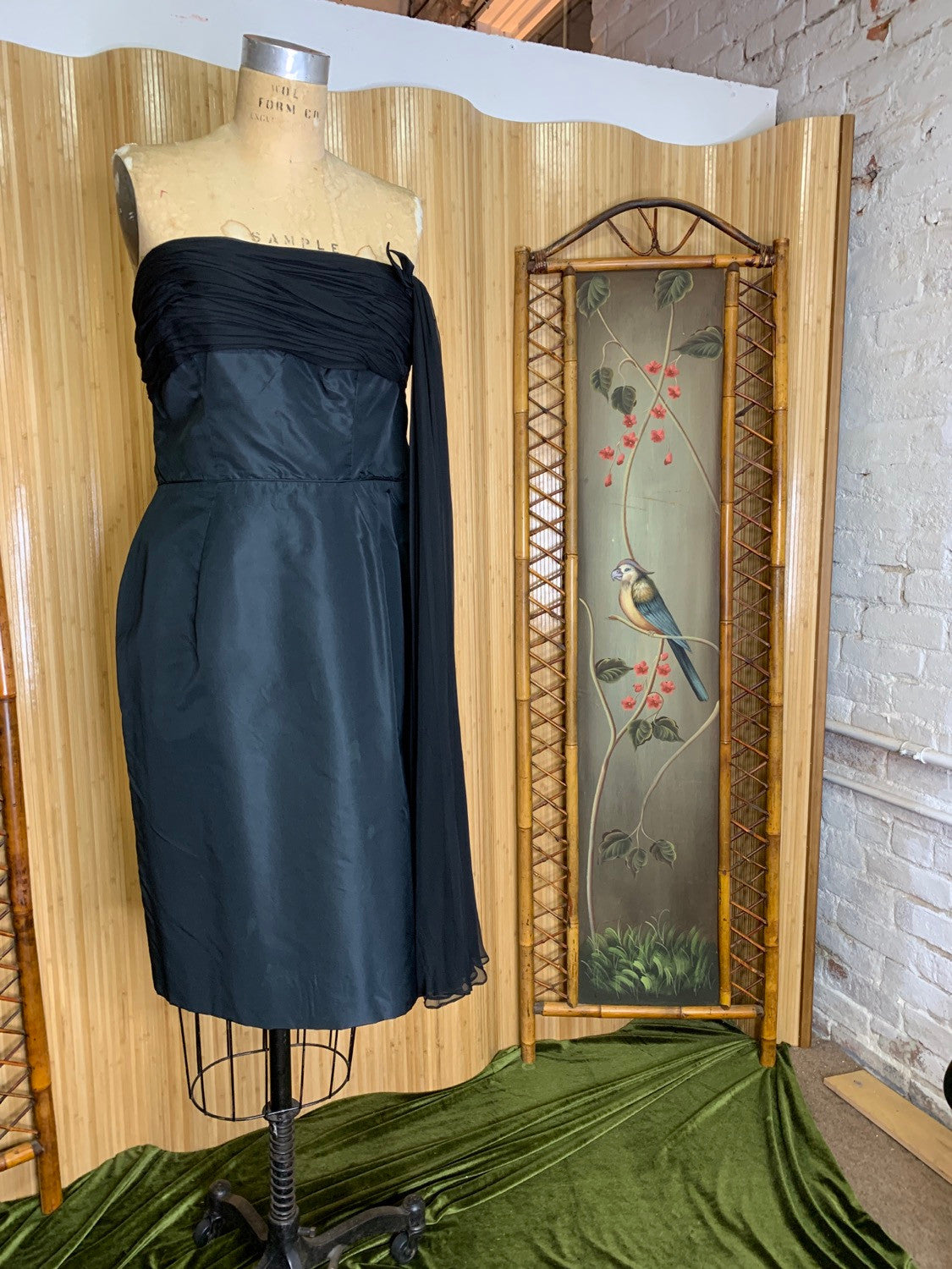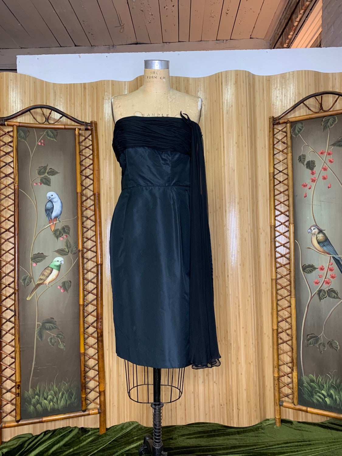 1950s black silk strapless wiggle dress with wrapped chiffon at the bust finishing with side-placed bow and dress-length sash. Utterly slinky!