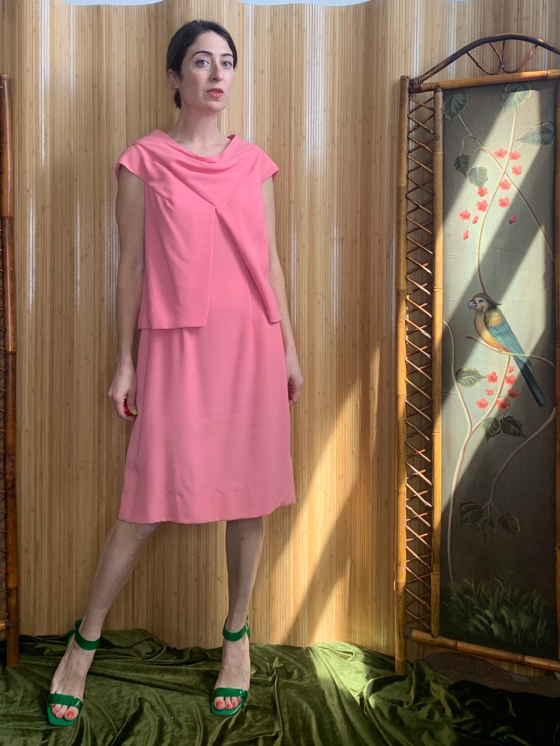 1960s Jackie O' perfection. A soft pink two piece-- sleeveless shift dress with a matching swing coverlet jacket. Total 60s silhouette. Dress and jacket wool crepe and lined in silk Jacket features a cowl neck, cap sleeves and a front slit to reveal dress underneath and zips in the back. Fabulous together or separate!