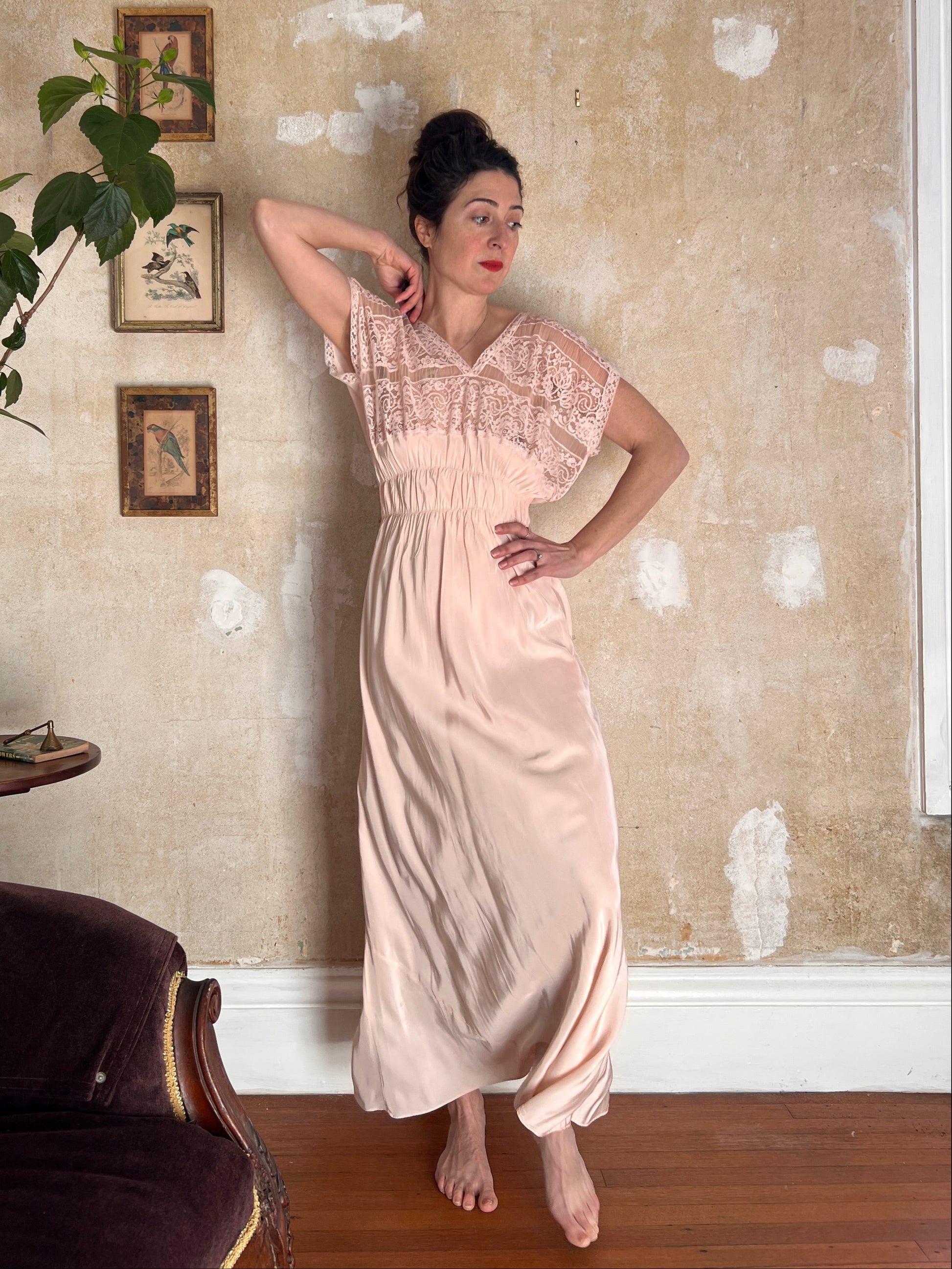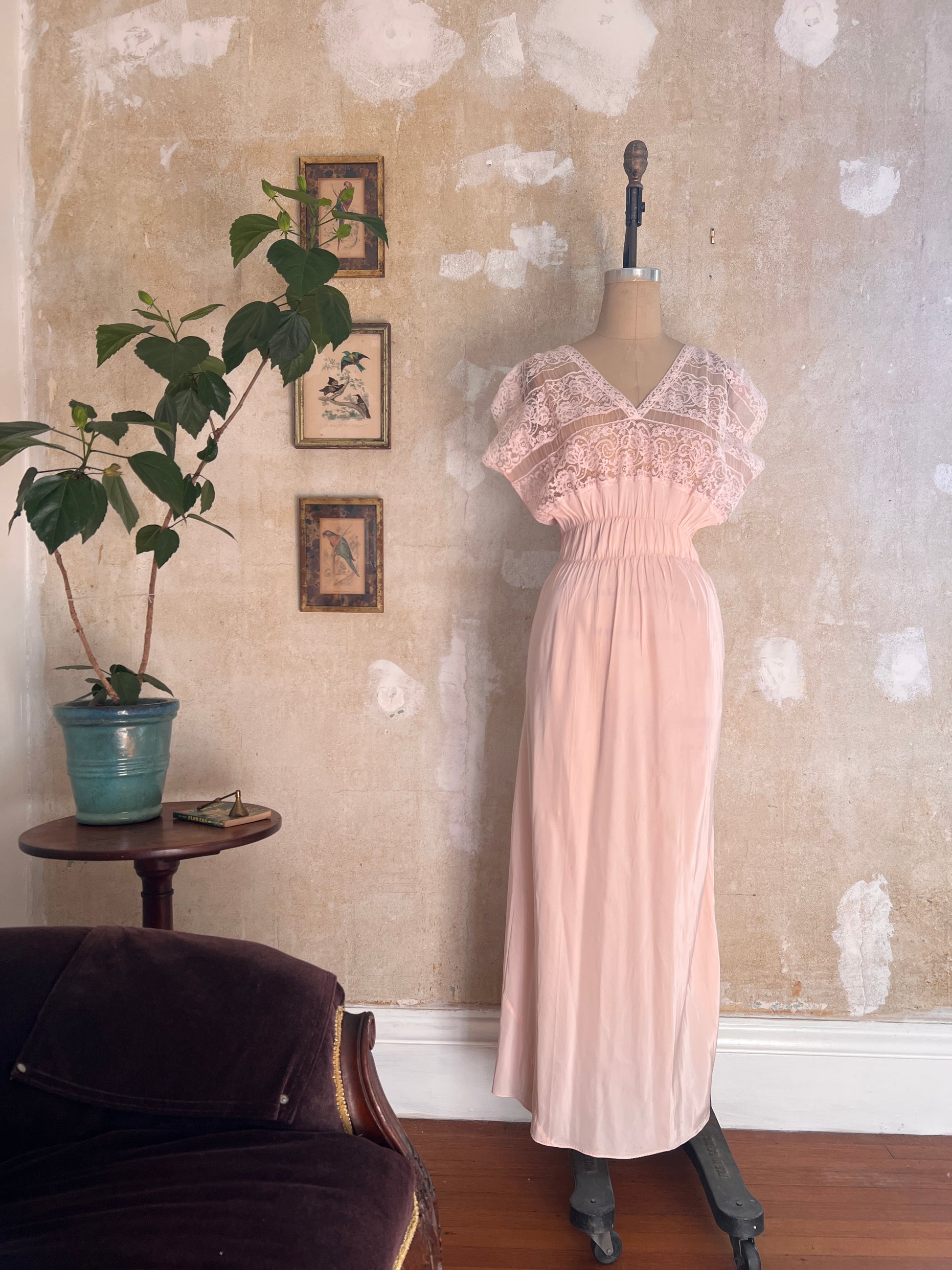 1940s Pink Rayon & Lace Grecian Bias Cut Gown S/M