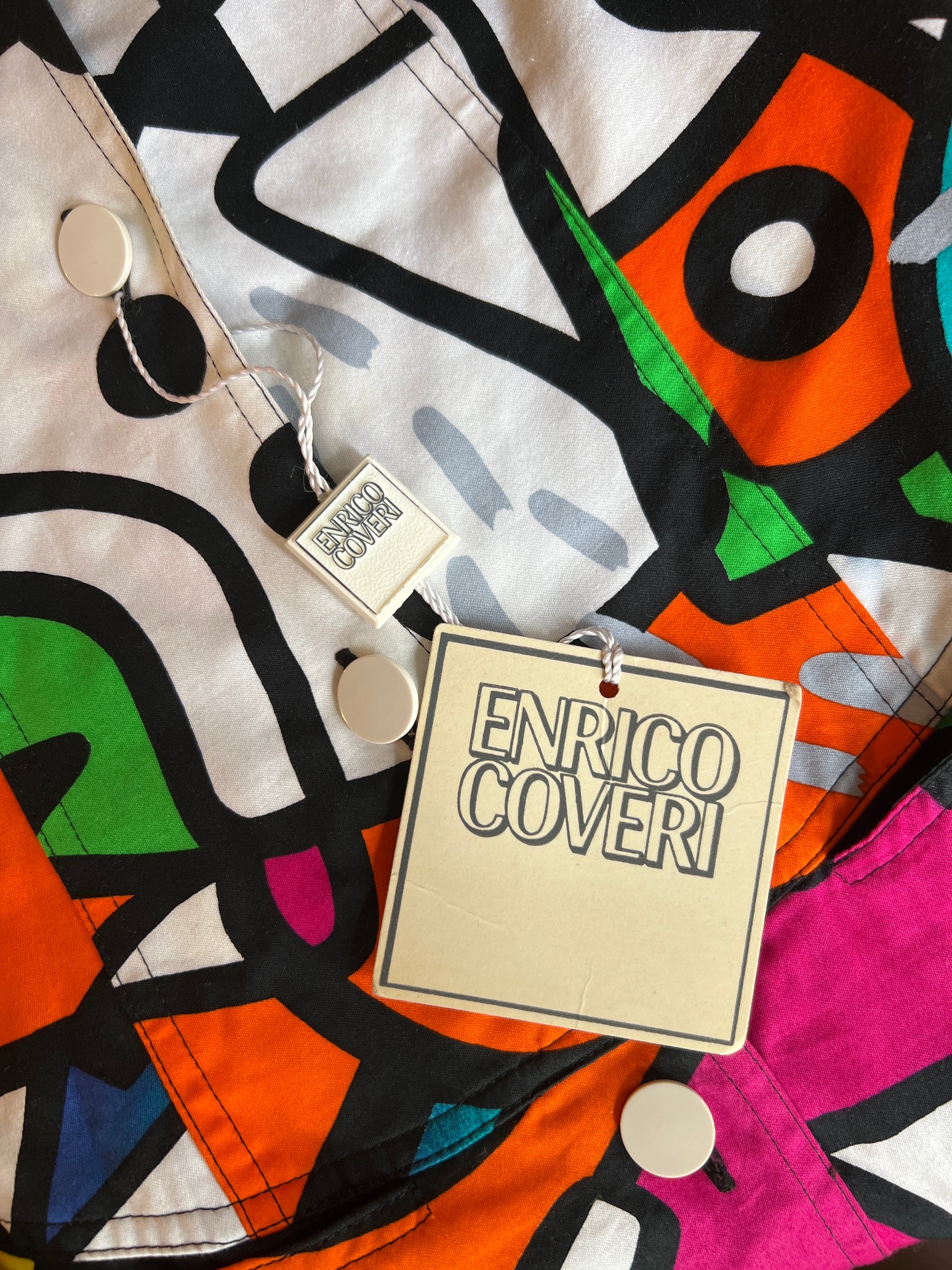 New Old Stock! 1980s Enrico Coveri Boutique fabulous pop art geometric print corset dress with a bustier bodice and calf-length fitted pencil skirt. Covered white buttons up the front, hidden front pockets. 100% cotton, Made in Italy, original tag attached