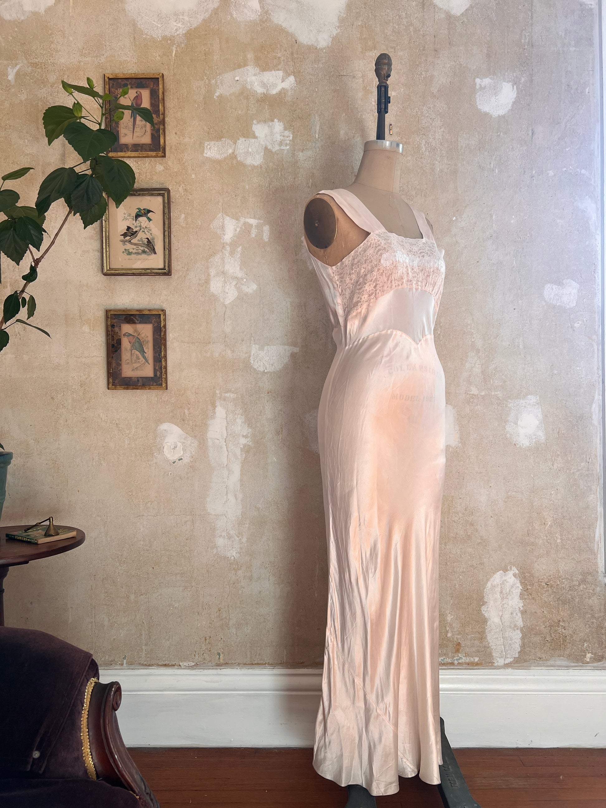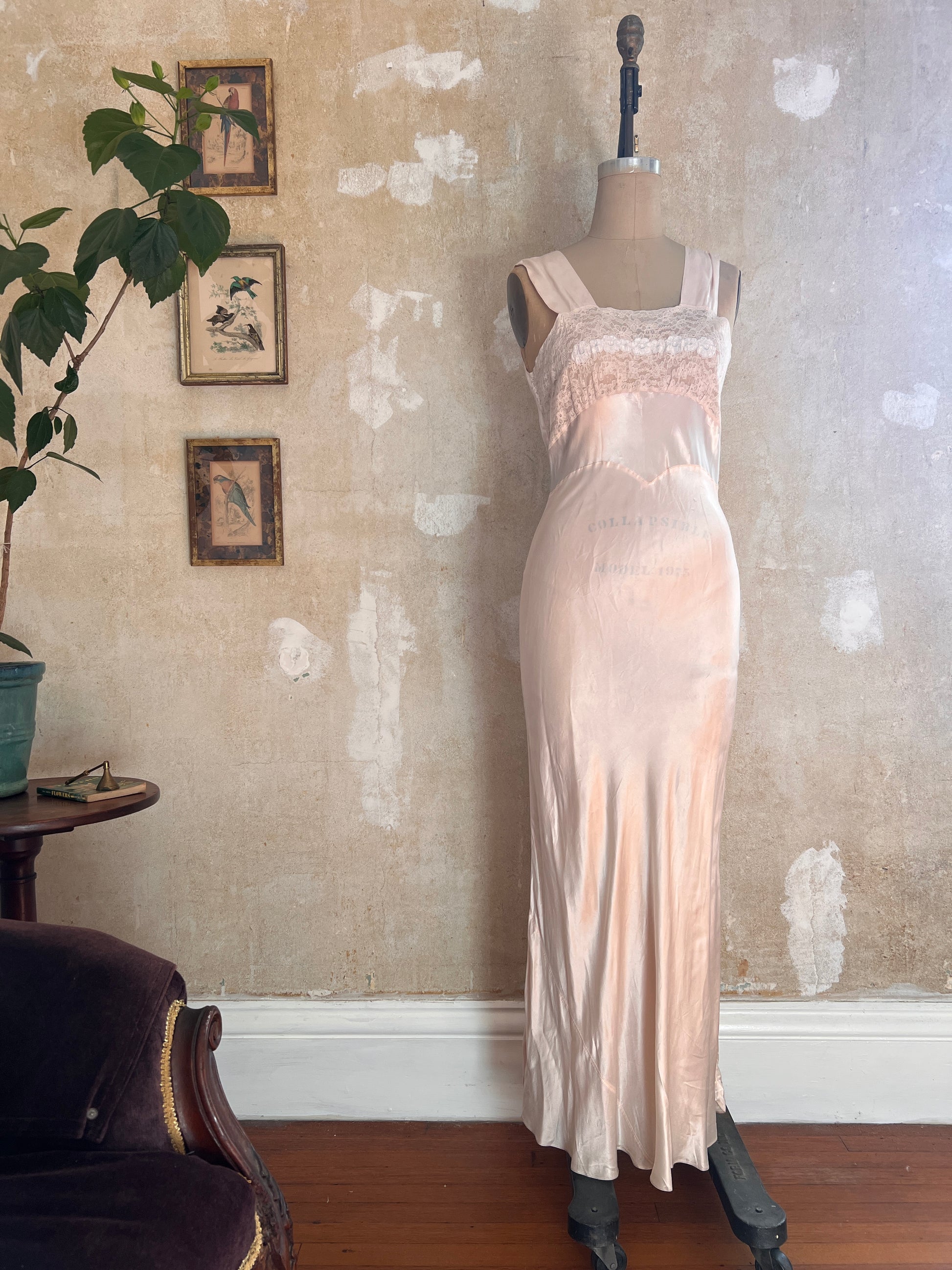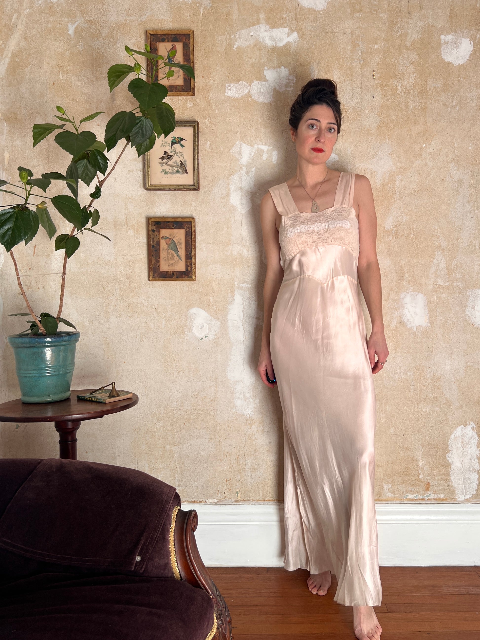 1930s Opalescent Bias Cut Silk and Lace Slip Dress S/M