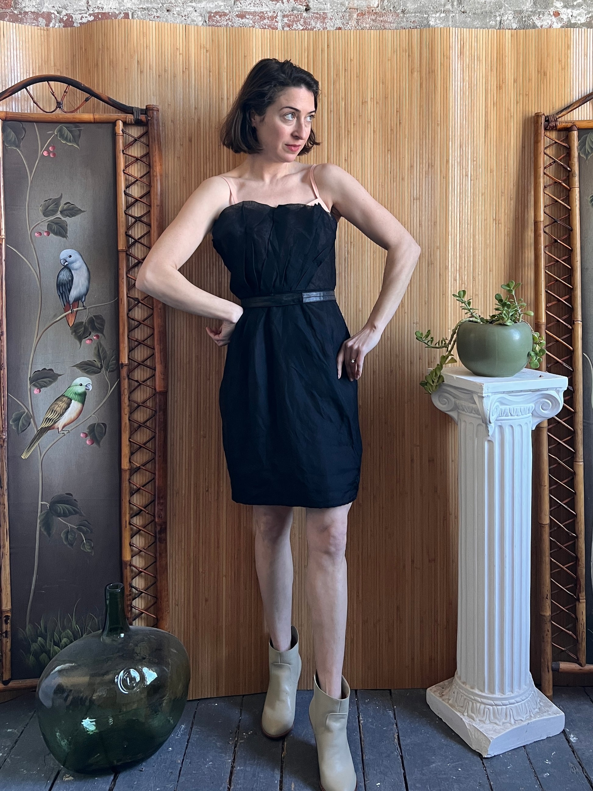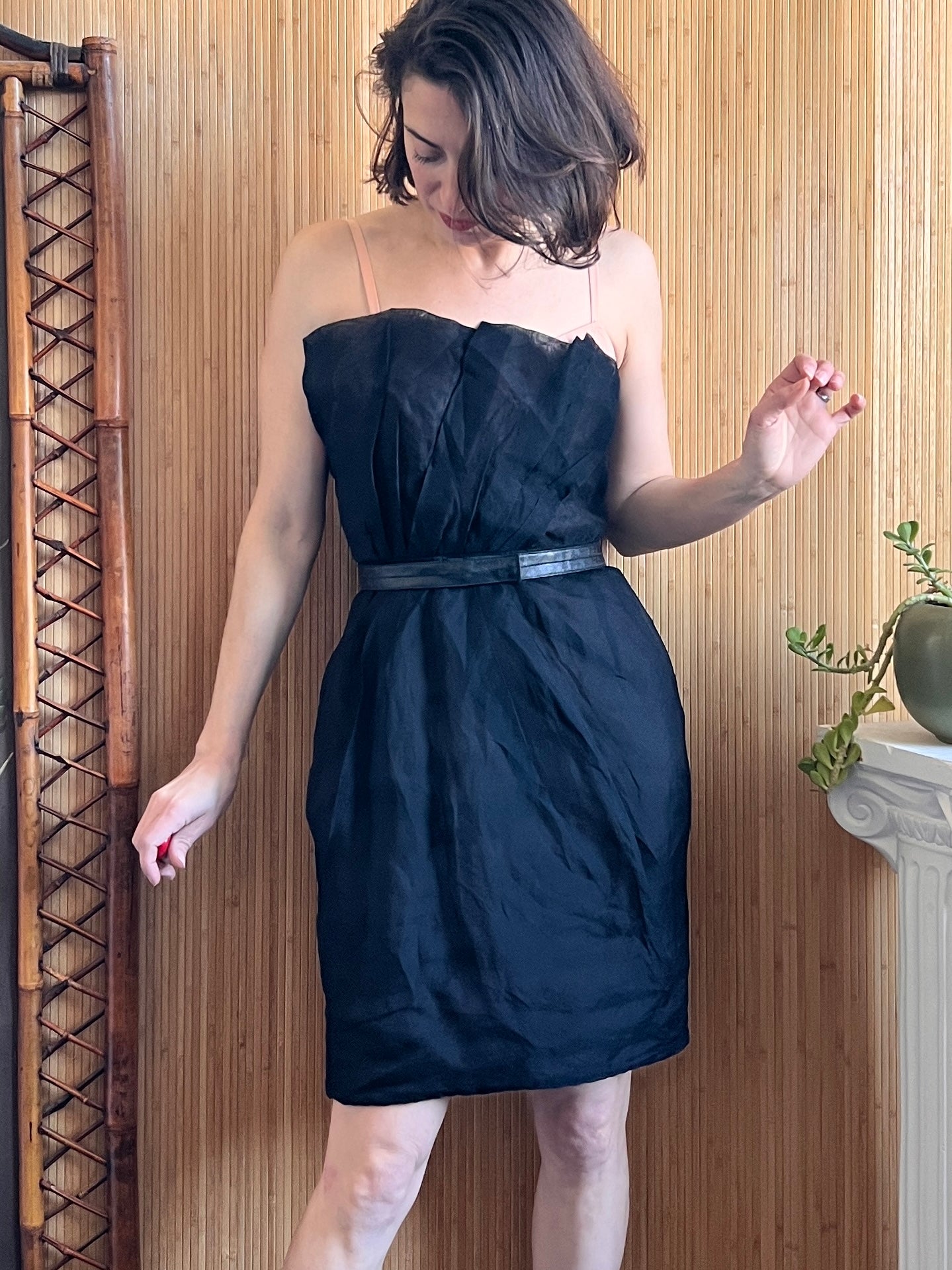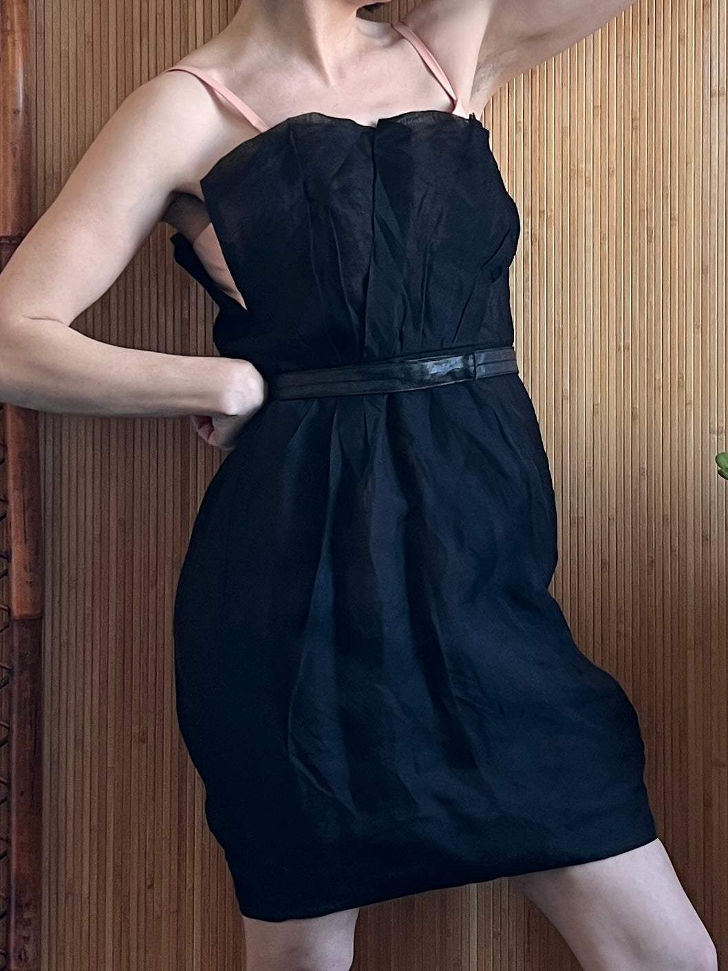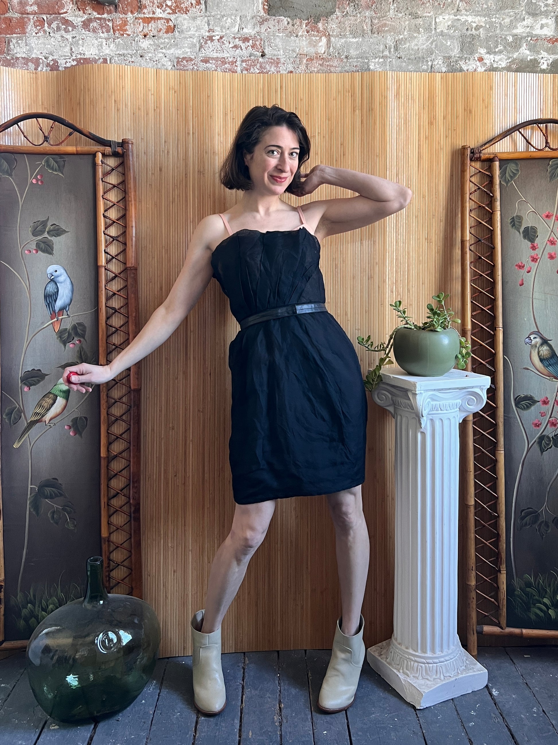 Party ready in this 00s Marc by Marc Jacobs mini dress. Pink bodice underlayer with pink spaghetti straps peeks out behind black silk taffeta. Skinny belt with hook closures. Fully lined.