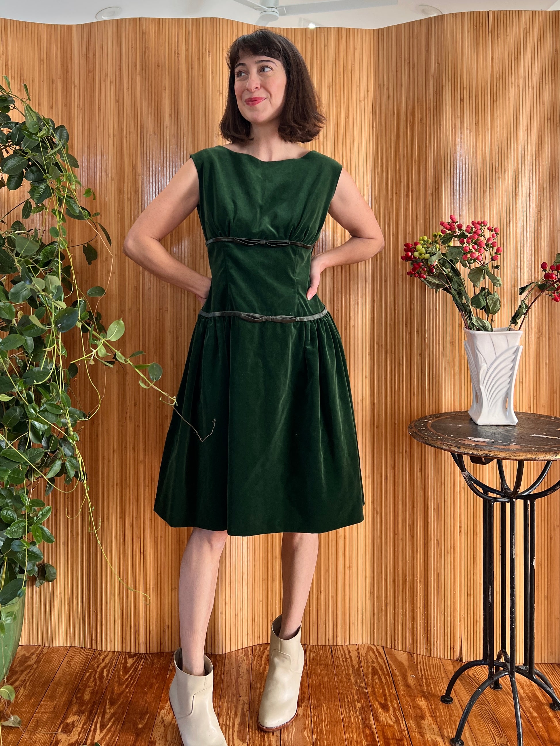 Adorable 1950s forest green velvet party dress with a midriff yoke bordered with ribbon and bow trim below the bust and at the drop waist. Sleeveless with a boat neck. Side zipper, fully lined in emerald green silk.
