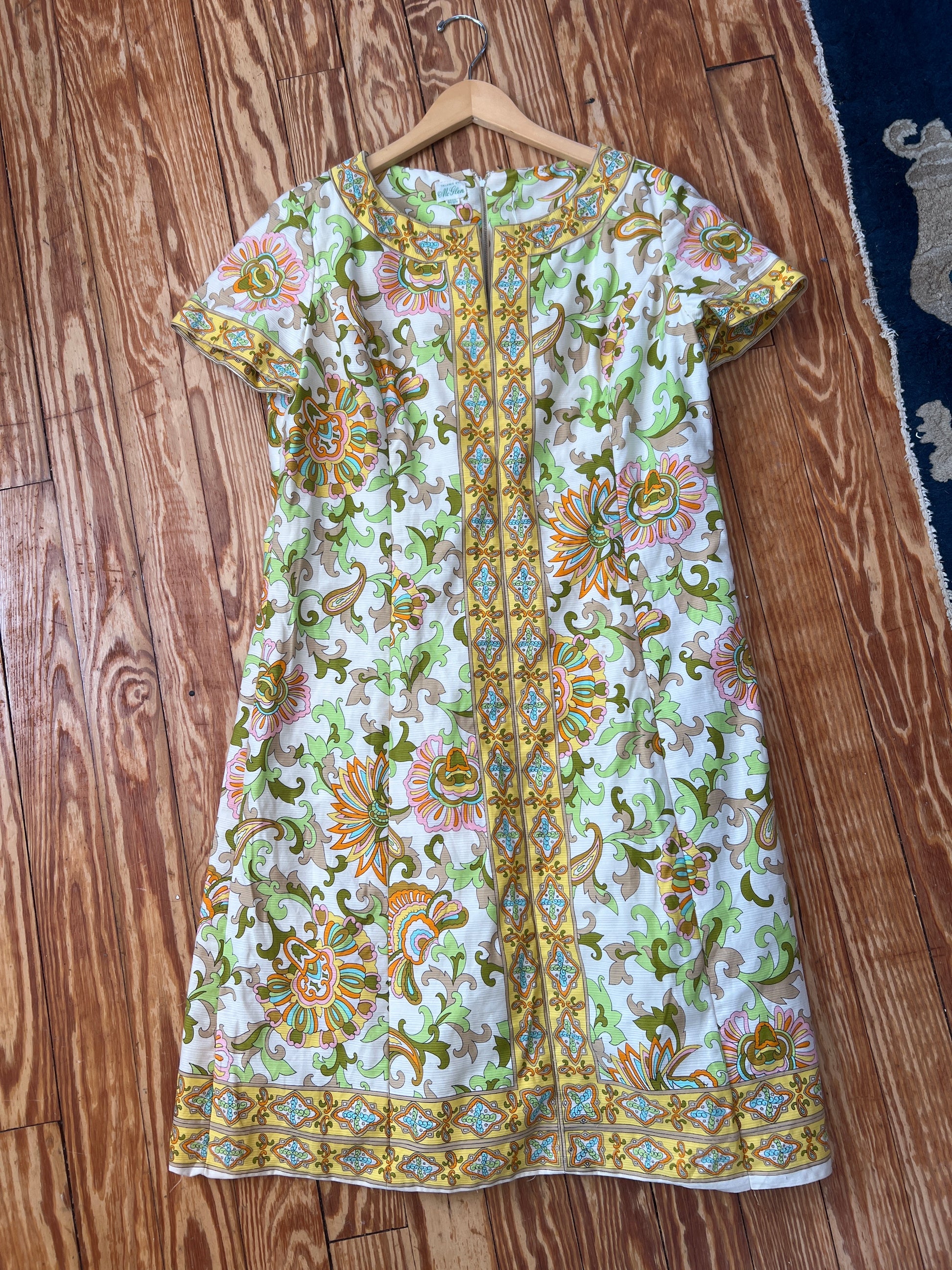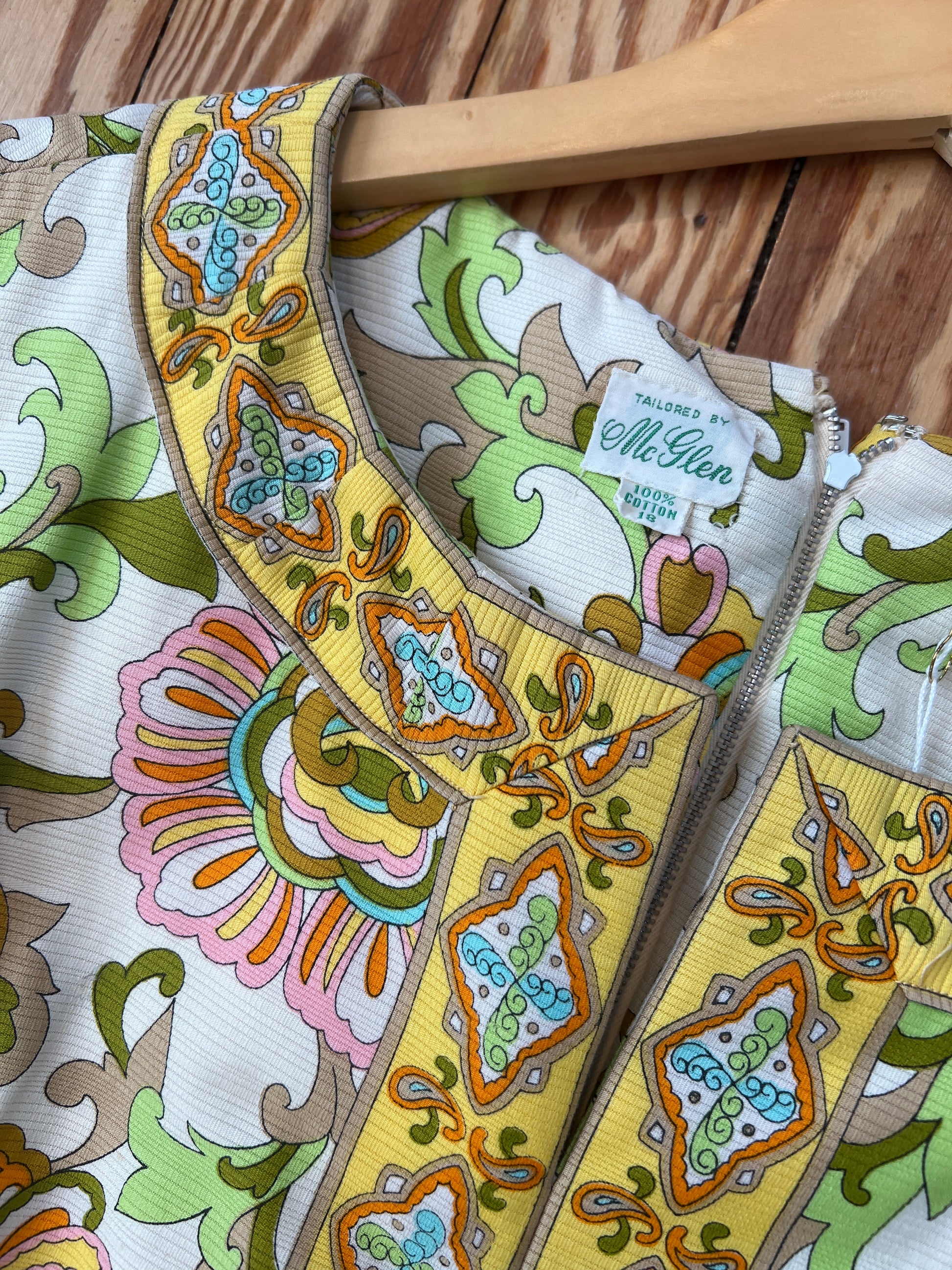 A 1960s cotton paisley in the loveliest pastel tones! Short sleeves, fully lined, back zipper. Tag reads Tailored by McGlen