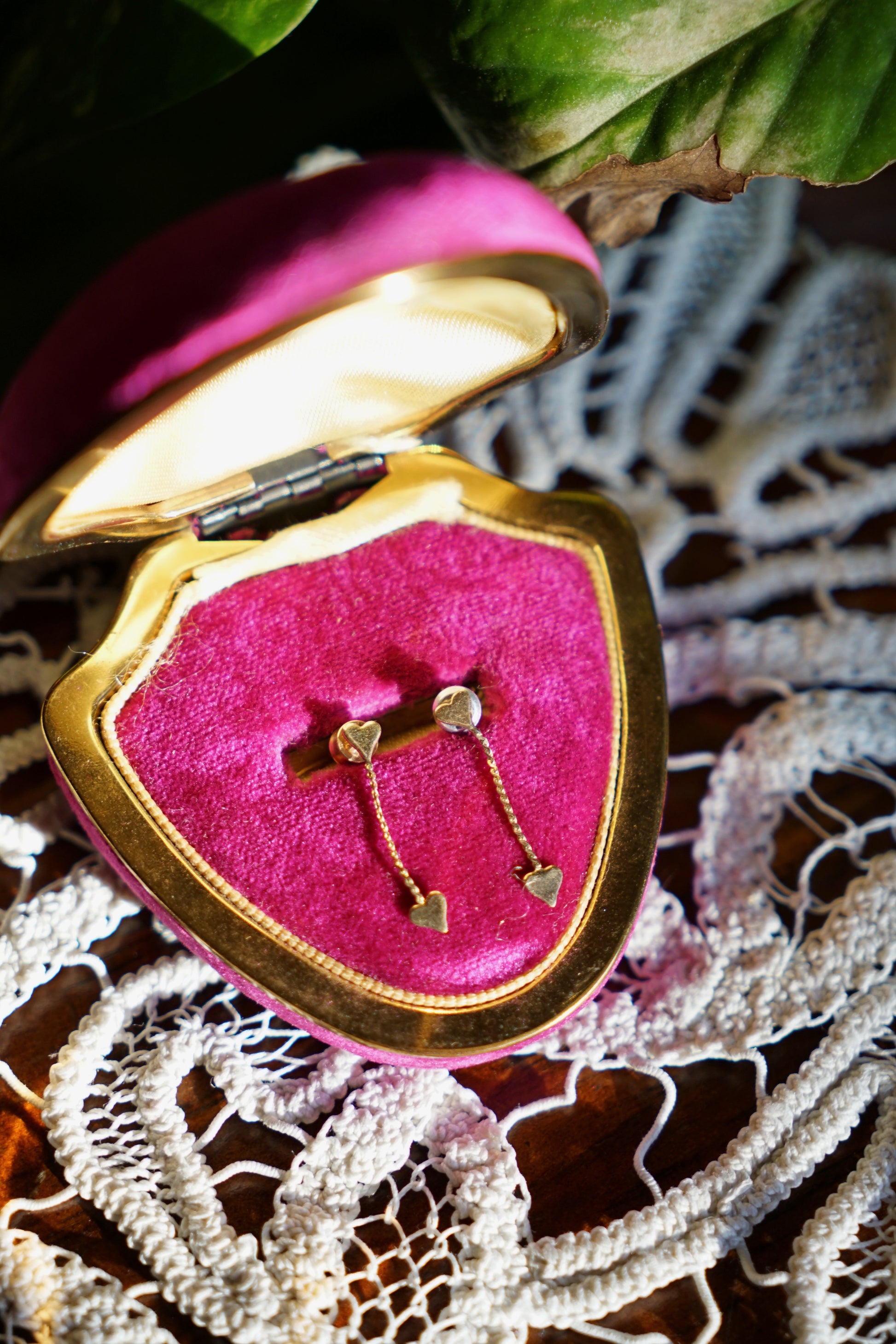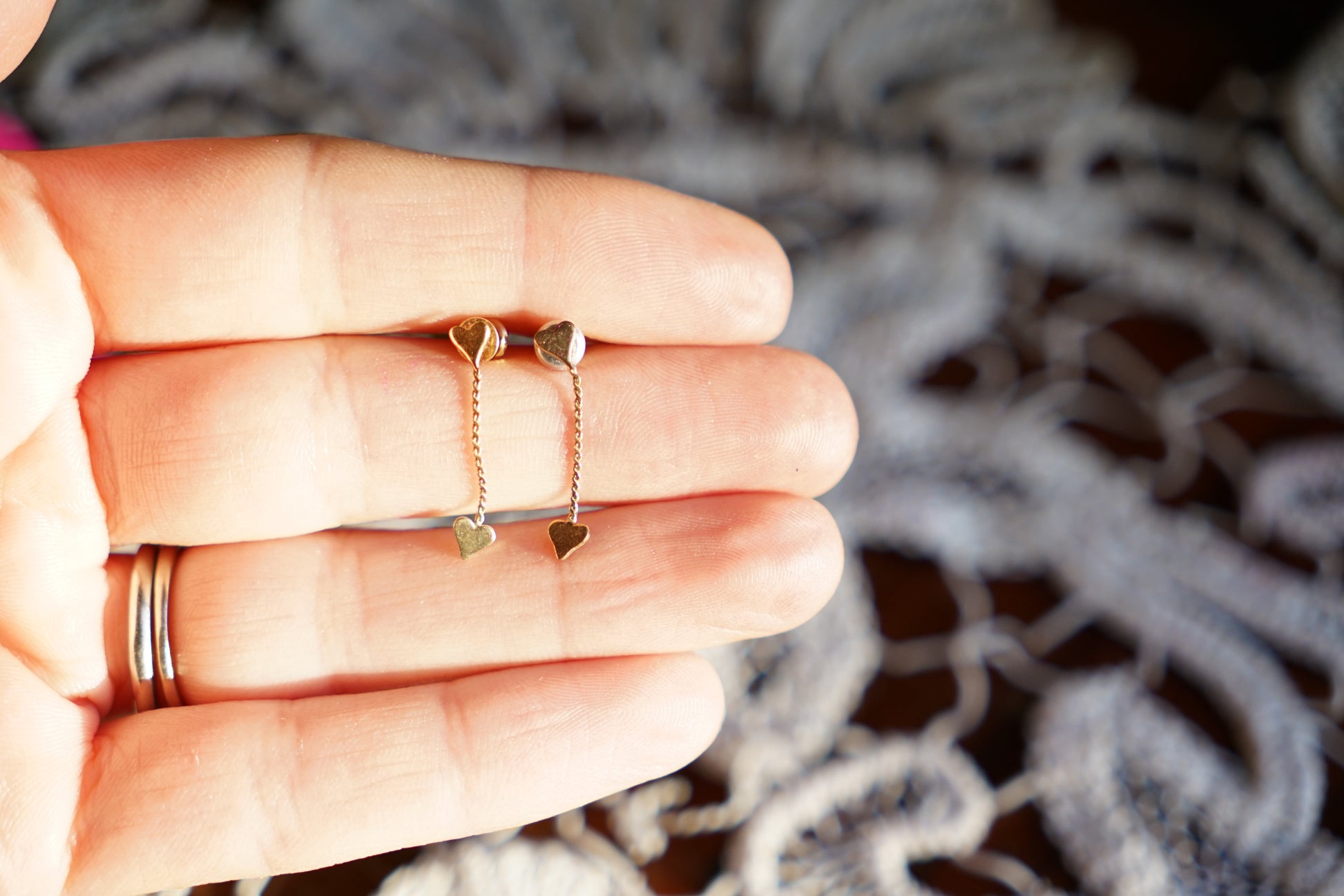 Delicate heart posts with a 1" chain drop punctuated by a second dangling heart. Subtle and sweet!