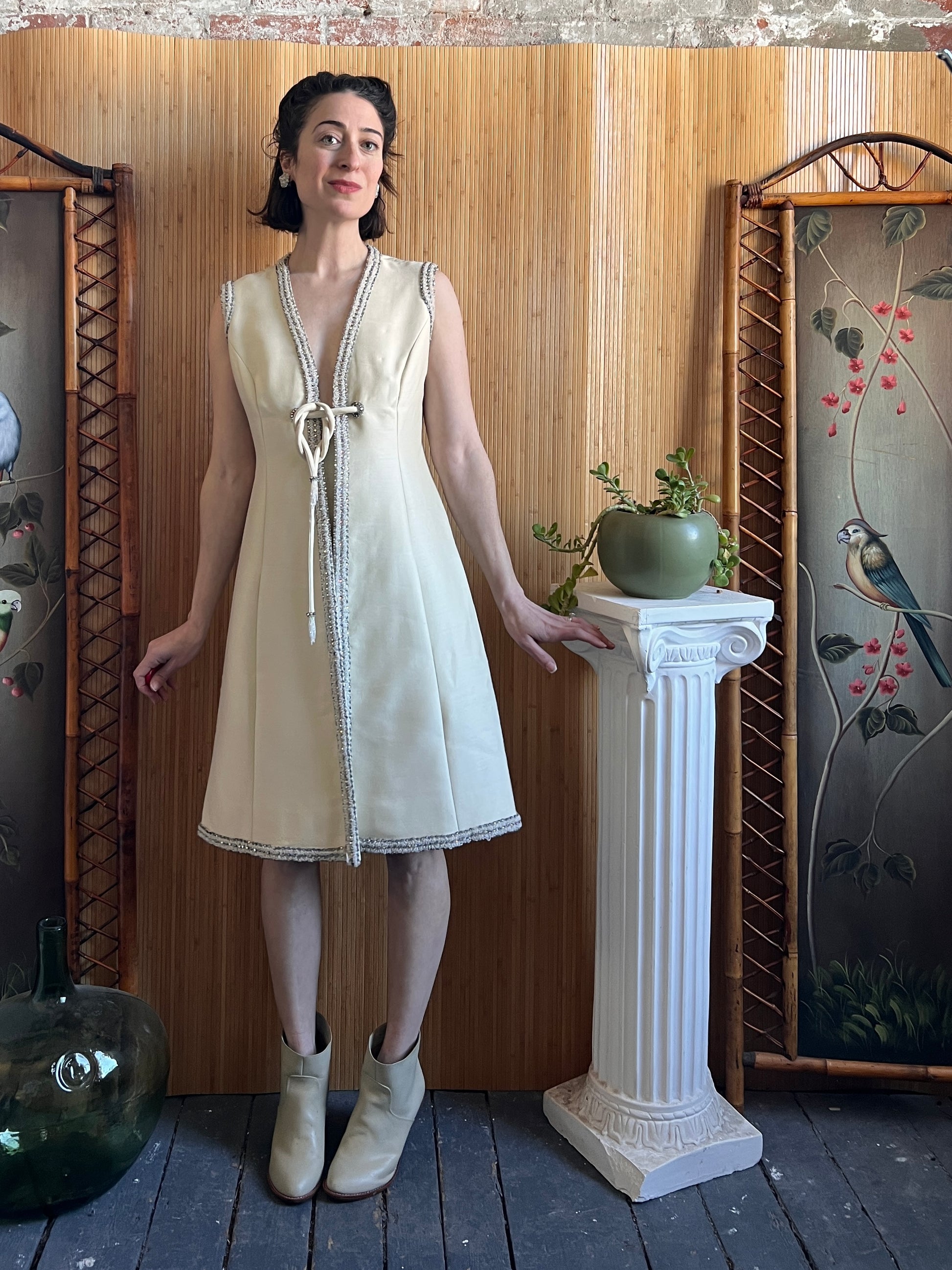 Such a 60s silhouette! Sleeveless silk shift dress with rhinestone and beaded trim, plunge neckline and a rope tie detail. Made of a thick silk fabric that gives the piece a nice shape and weight. Hand beaded detail along the neckline and hem.Fully lined, back zipper.