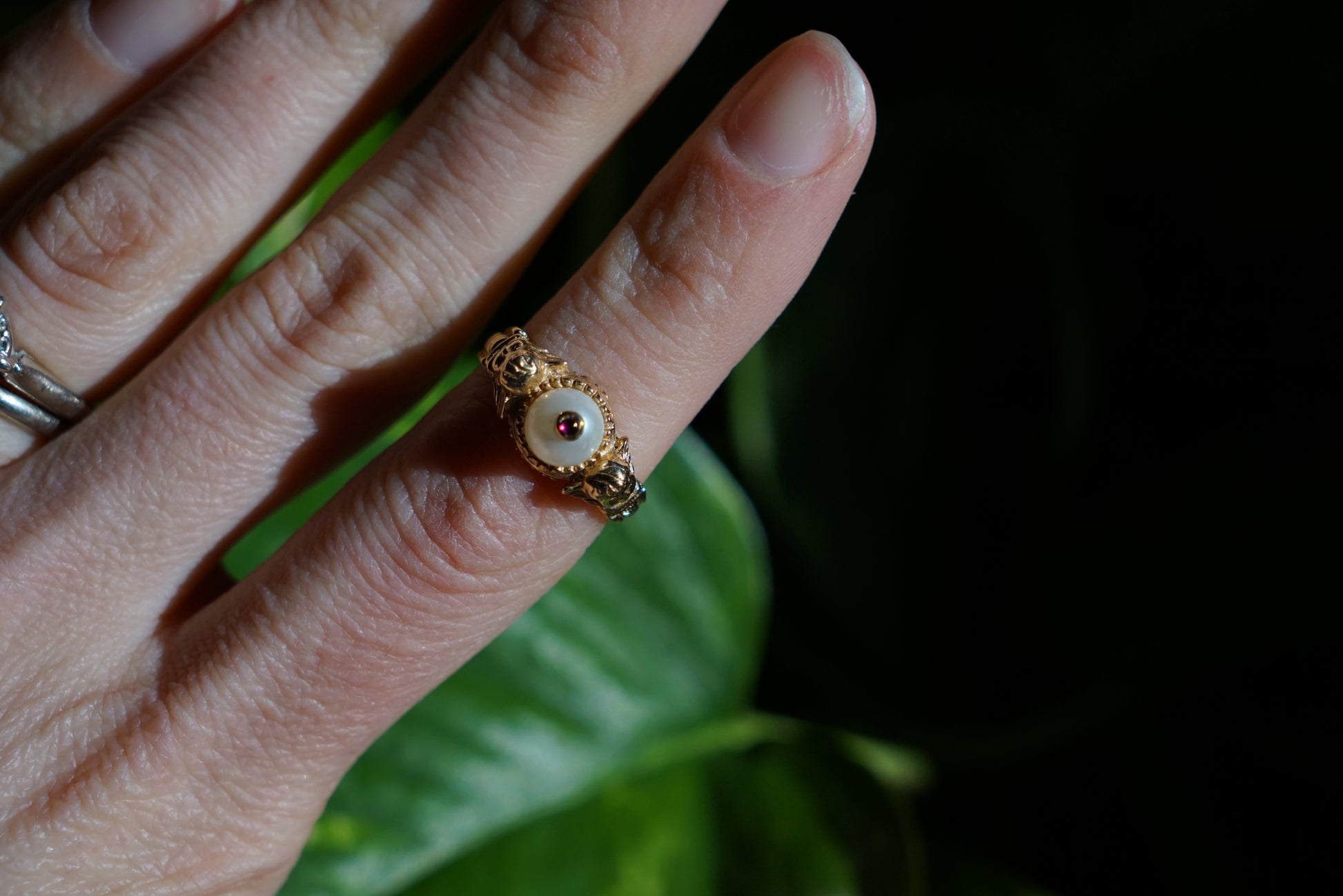 Vintage 14k gold, cultured pearl cabochon with ruby ring in the Etruscan style, with 2 carved cherub figurines flanking the ruby-adorned pearl. From the Boston MFA (Museum of Fine Arts) jewelry collection