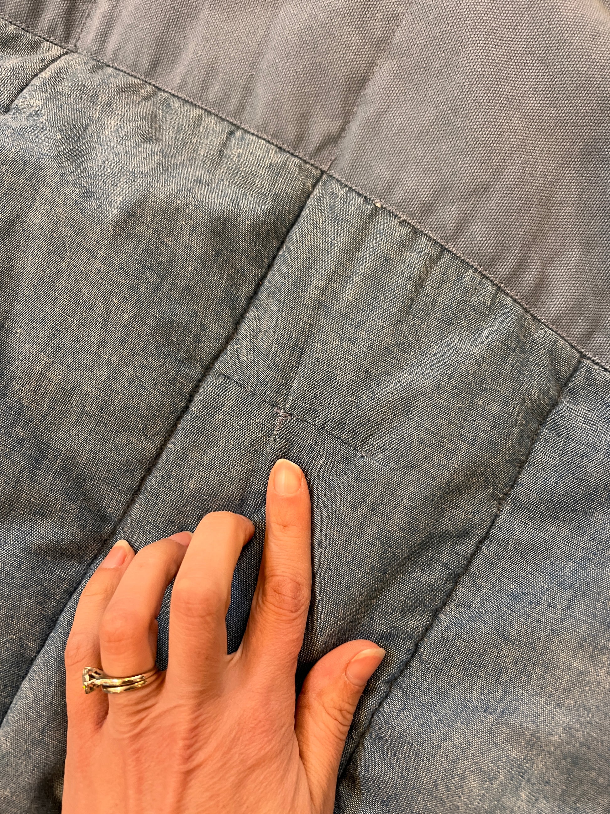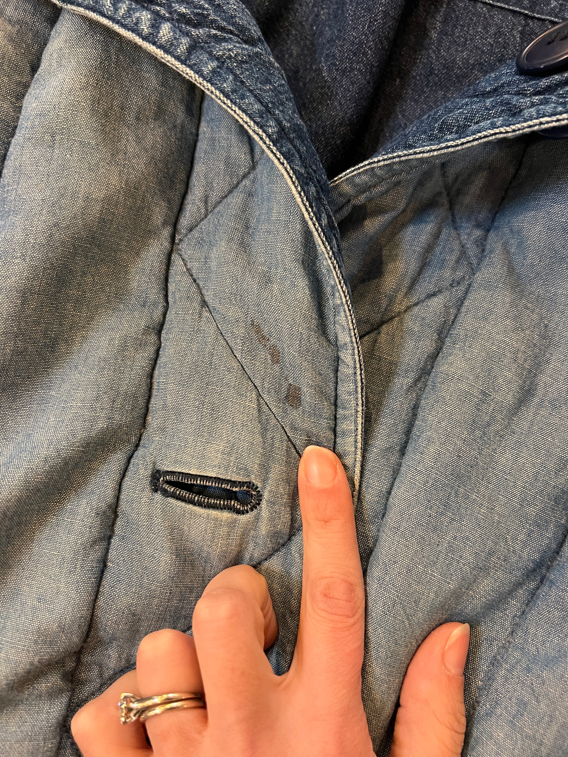 Condition: Very good. Original owner has made slight stitched repairs to lighter denim interior, please see photos for condition notes. One stain on lighter denim interior front. Garment has been washed and is ready to wear.