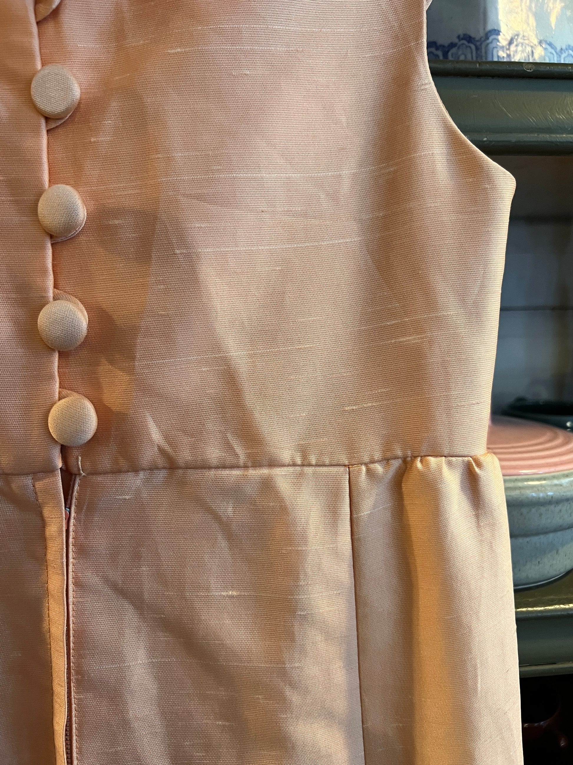 Lovely 1960s peach dupioni silk column dress with an epic ruffed neckline with a center bow. Empire waist. Fully lined. Covered buttons up the back and back zipper.