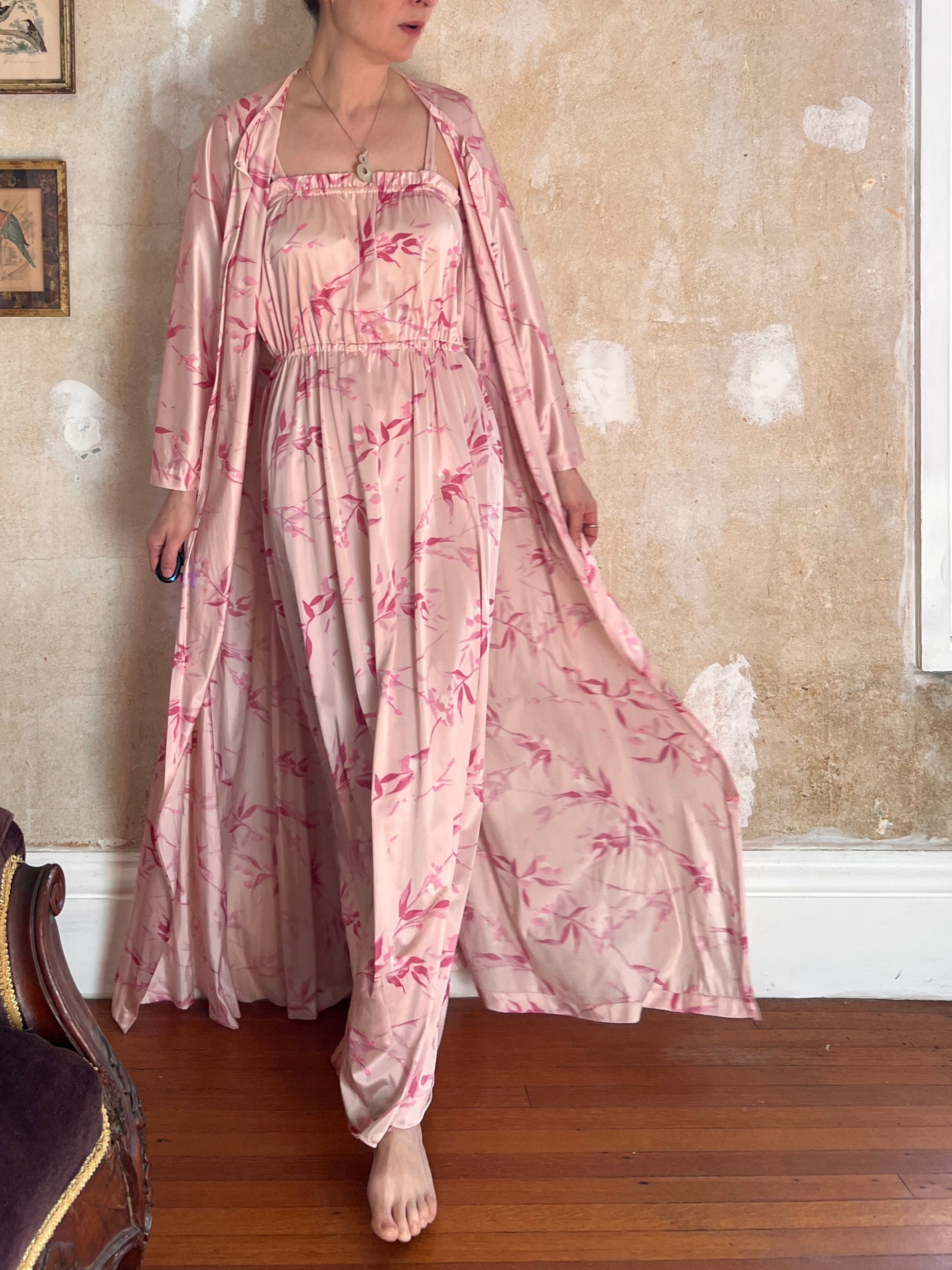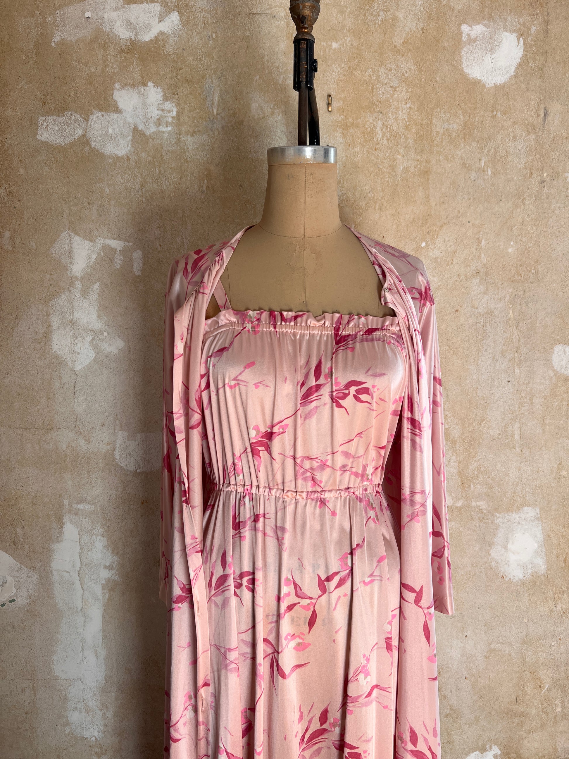 Cute floral peignoir by Vanity Fair. Thin strap nightgown with slight empire elastic waist and ruffled neckline with a long sleeve button front robe. 100% Nylon