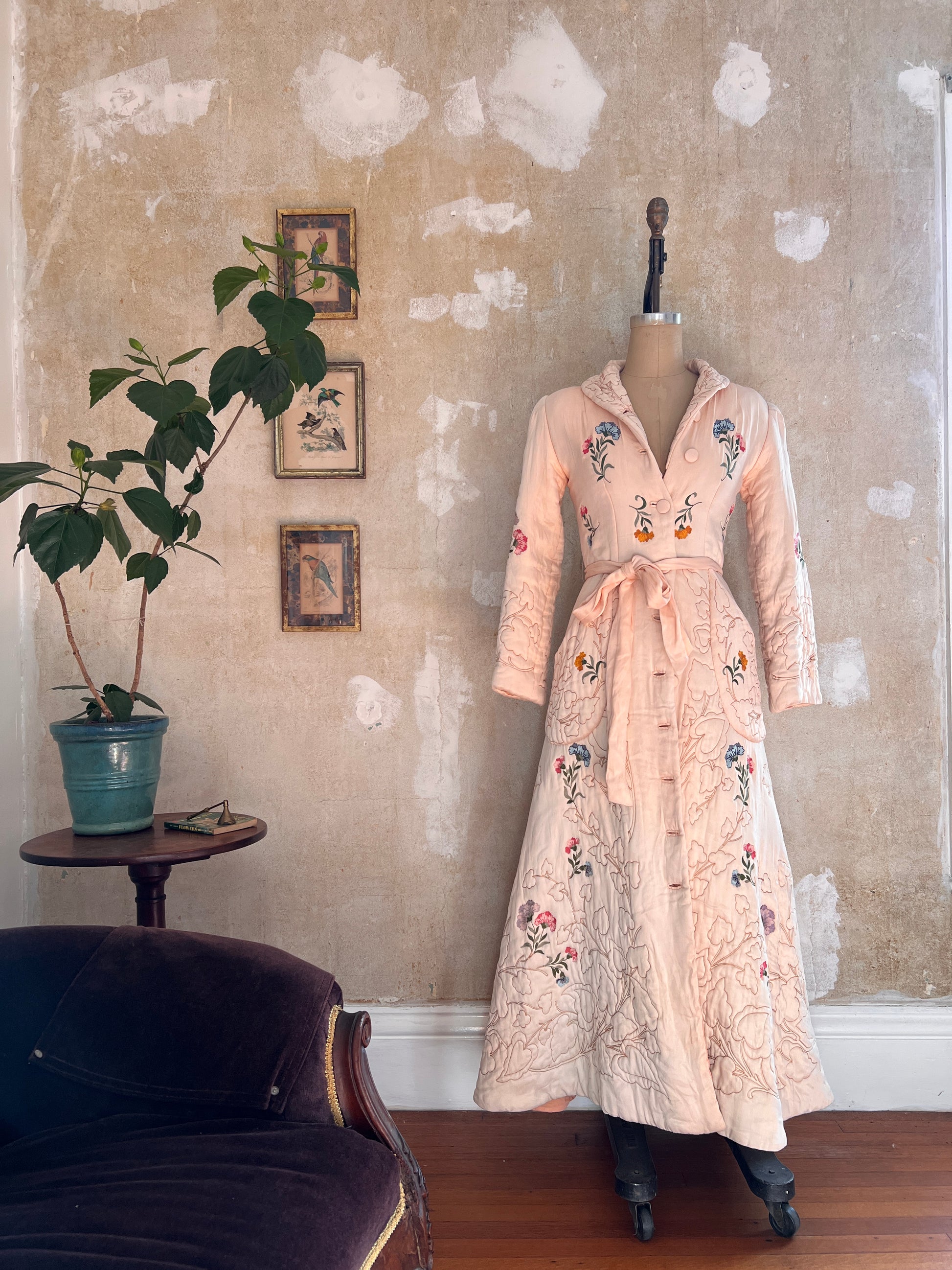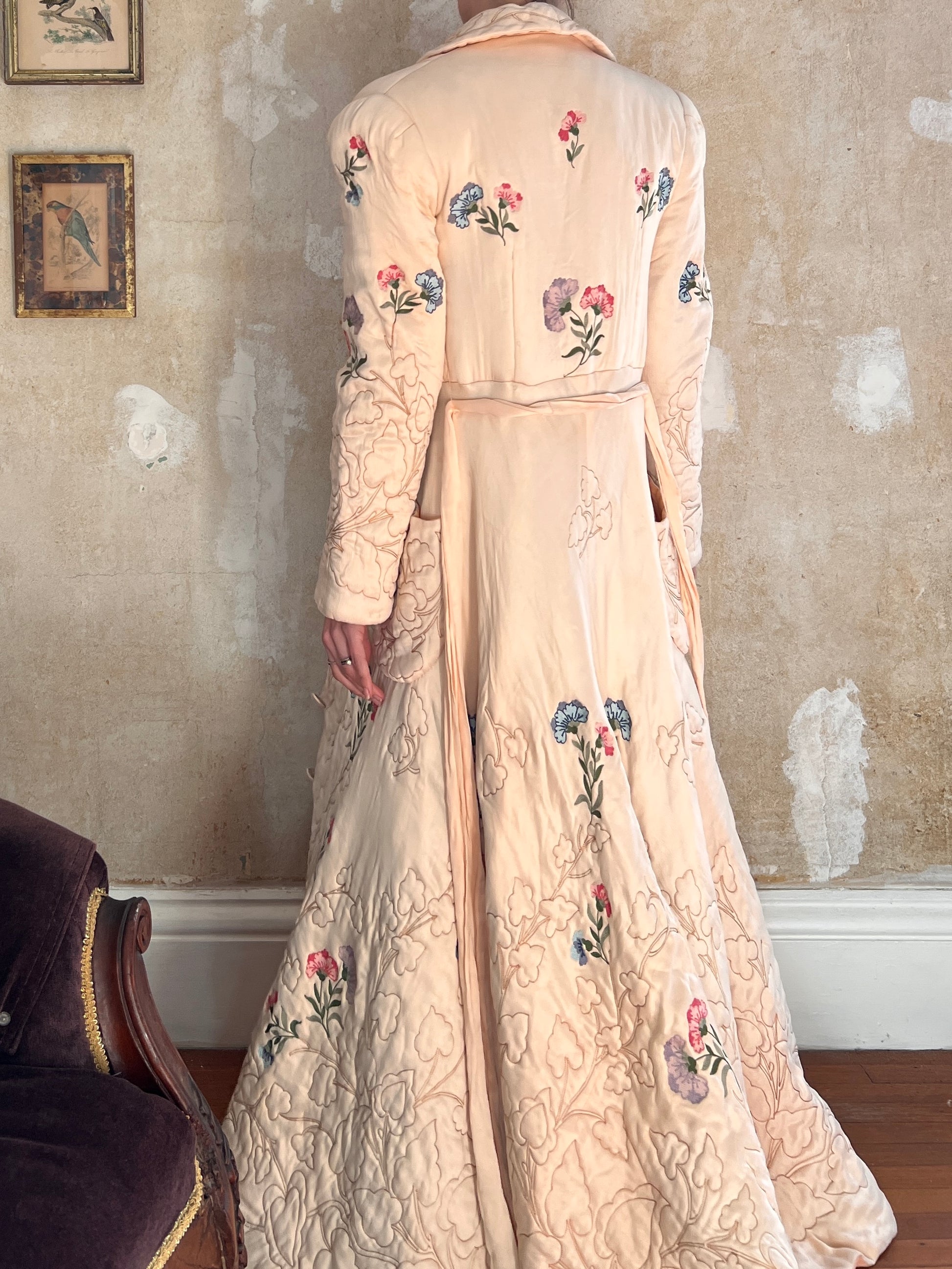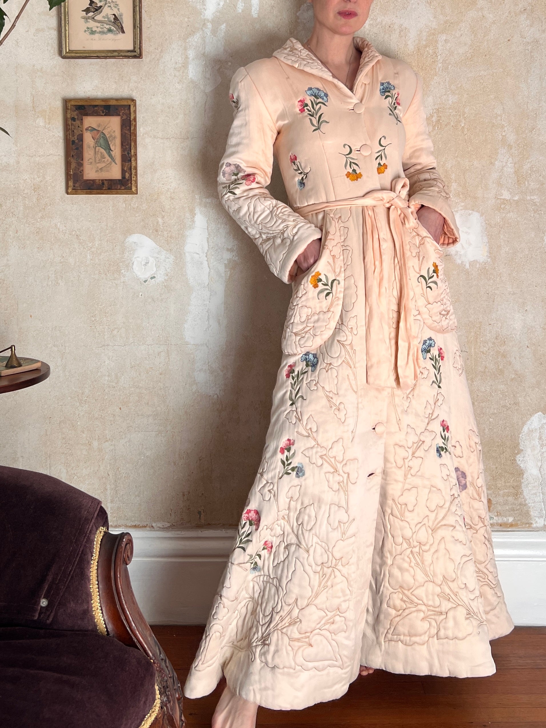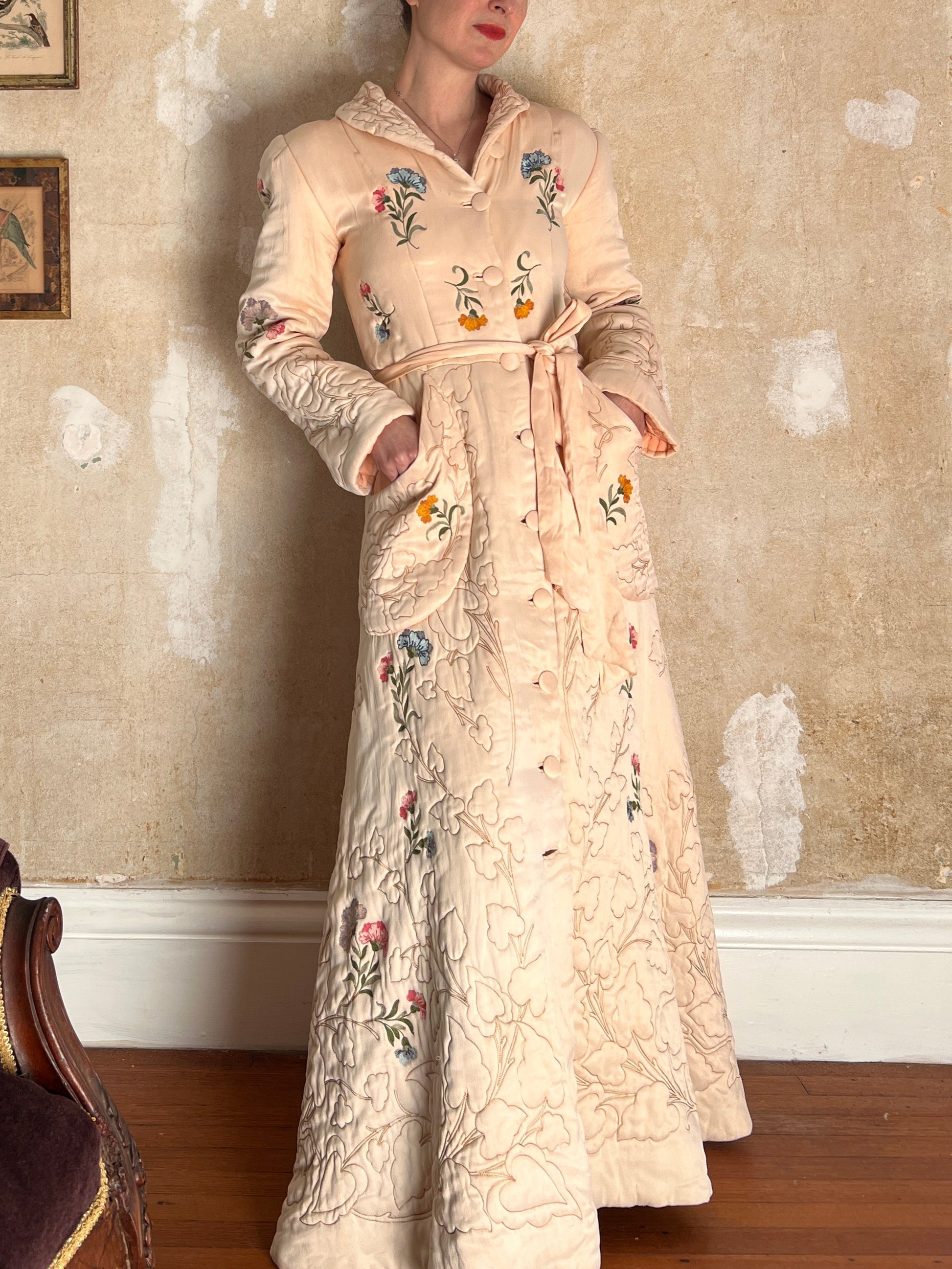 Incredible 1930s/40s pale peach quilted dressing gown/robe with intricate embroidered floral design and a quilted gold thread leaf motif throughout. Fully lined in pink silk, covered buttons up the front, large pockets, cinched waist, padded shoulders and silk sash tie. Very old Hollywood glamour. Would make an excellent bridal getting-ready piece! Made by Freny 368 Rue St Honore Paris