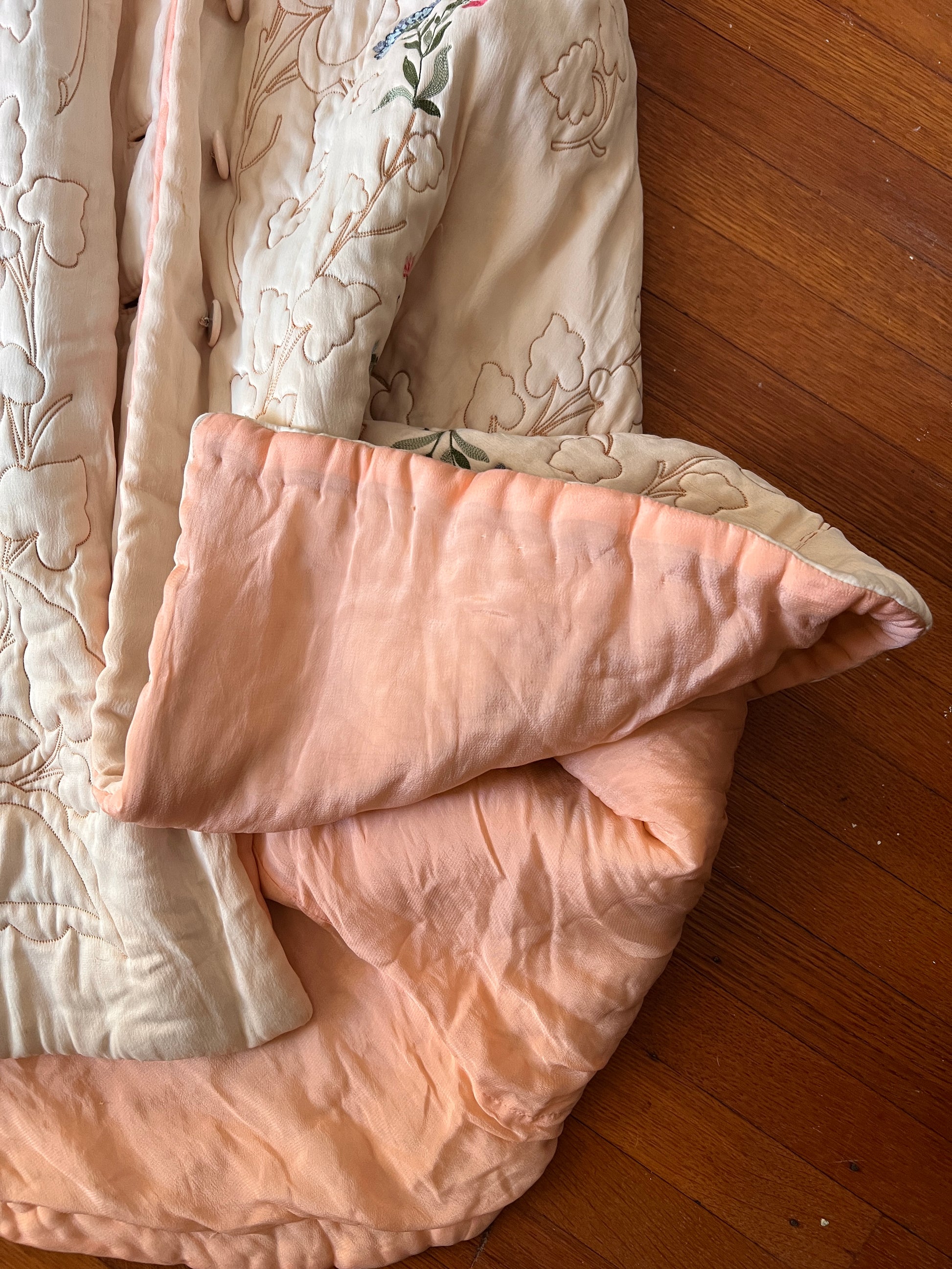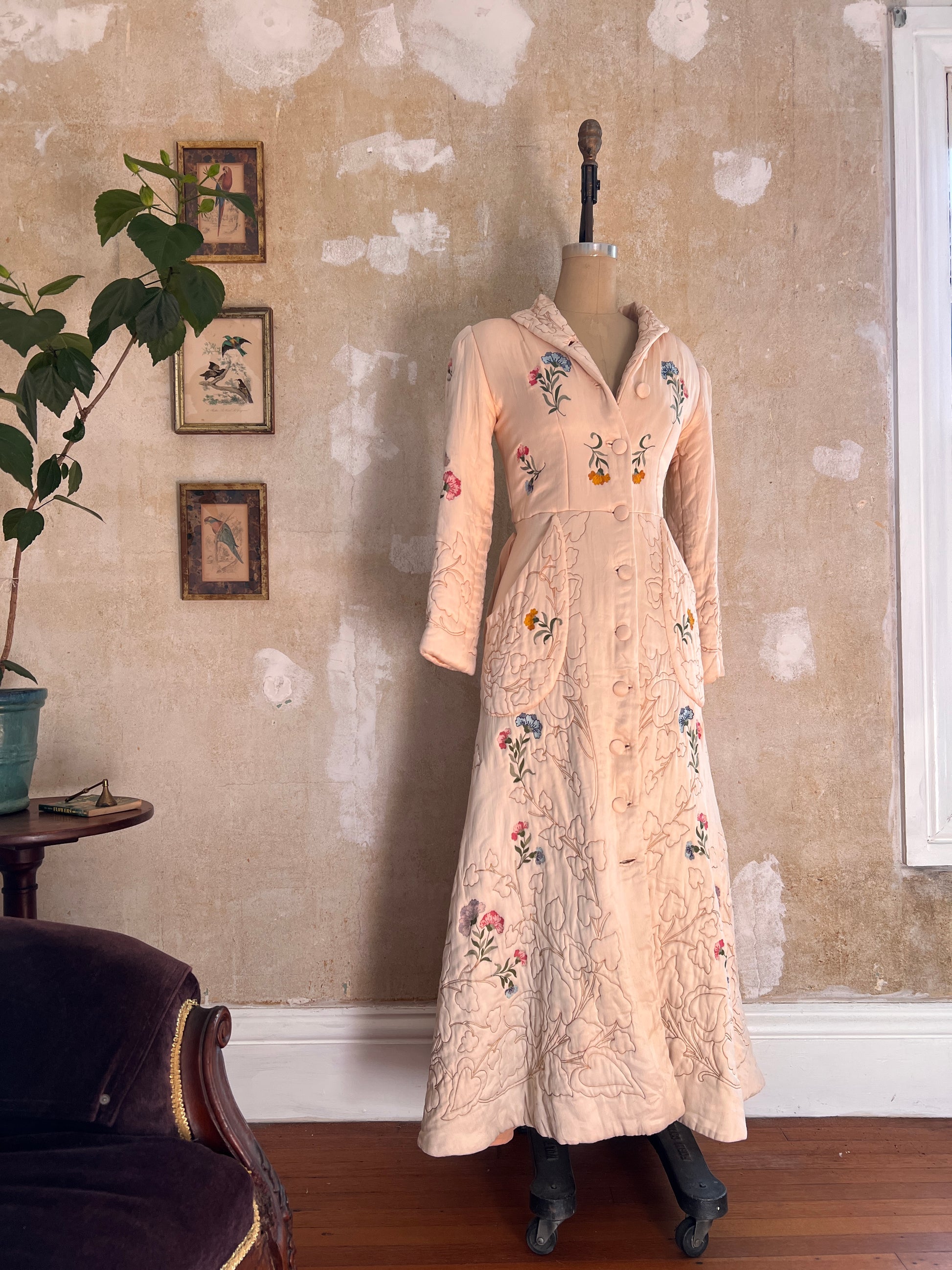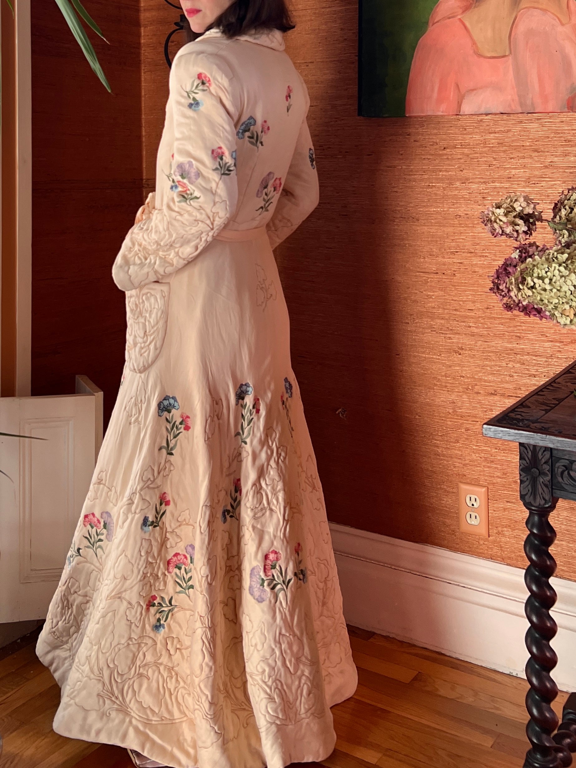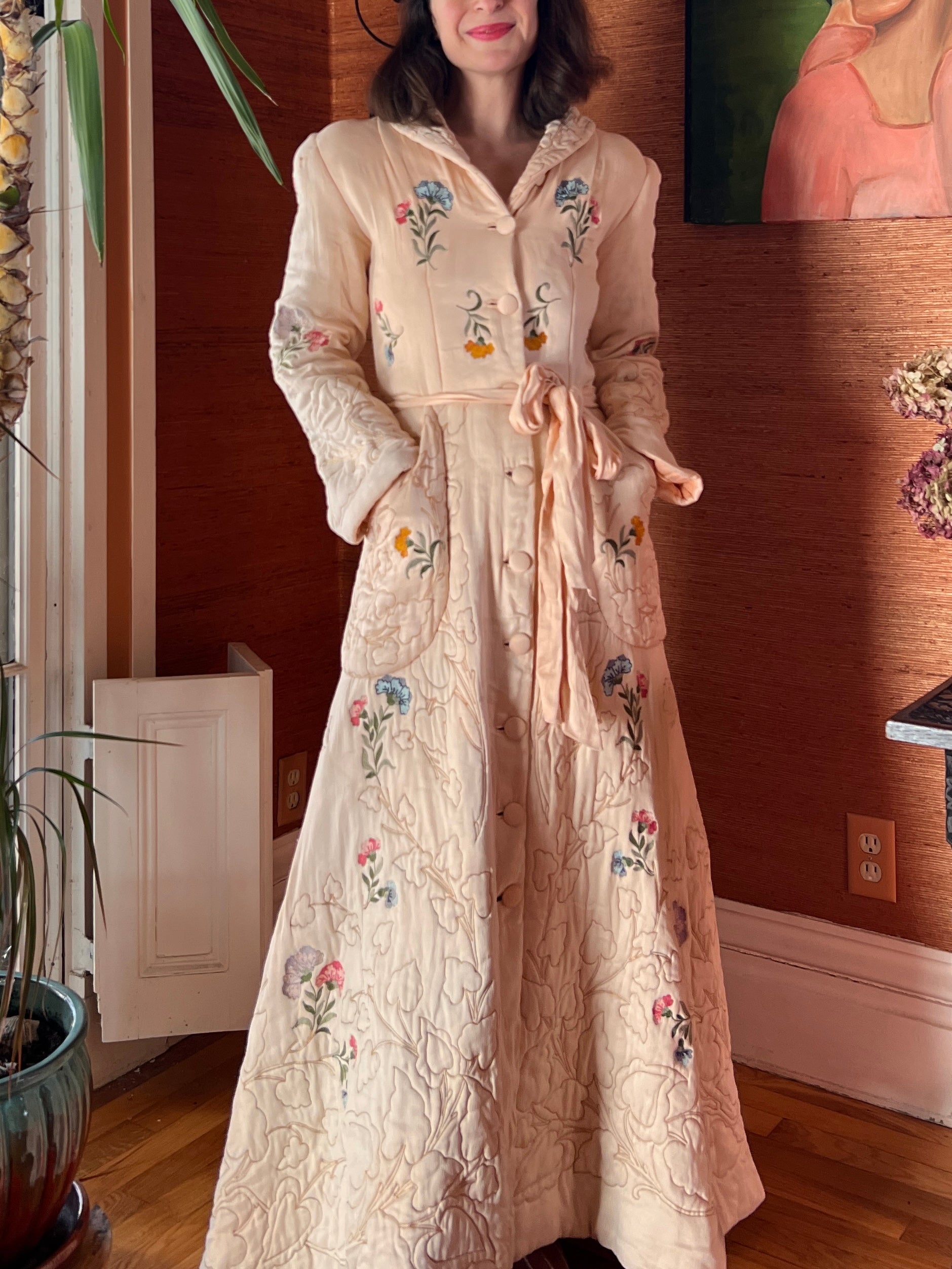 Incredible 1930s/40s pale peach quilted dressing gown/robe with intricate embroidered floral design and a quilted gold thread leaf motif throughout. Fully lined in pink silk, covered buttons up the front, large pockets, cinched waist, padded shoulders and silk sash tie. Very old Hollywood glamour. Would make an excellent bridal getting-ready piece! Made by Freny 368 Rue St Honore Paris