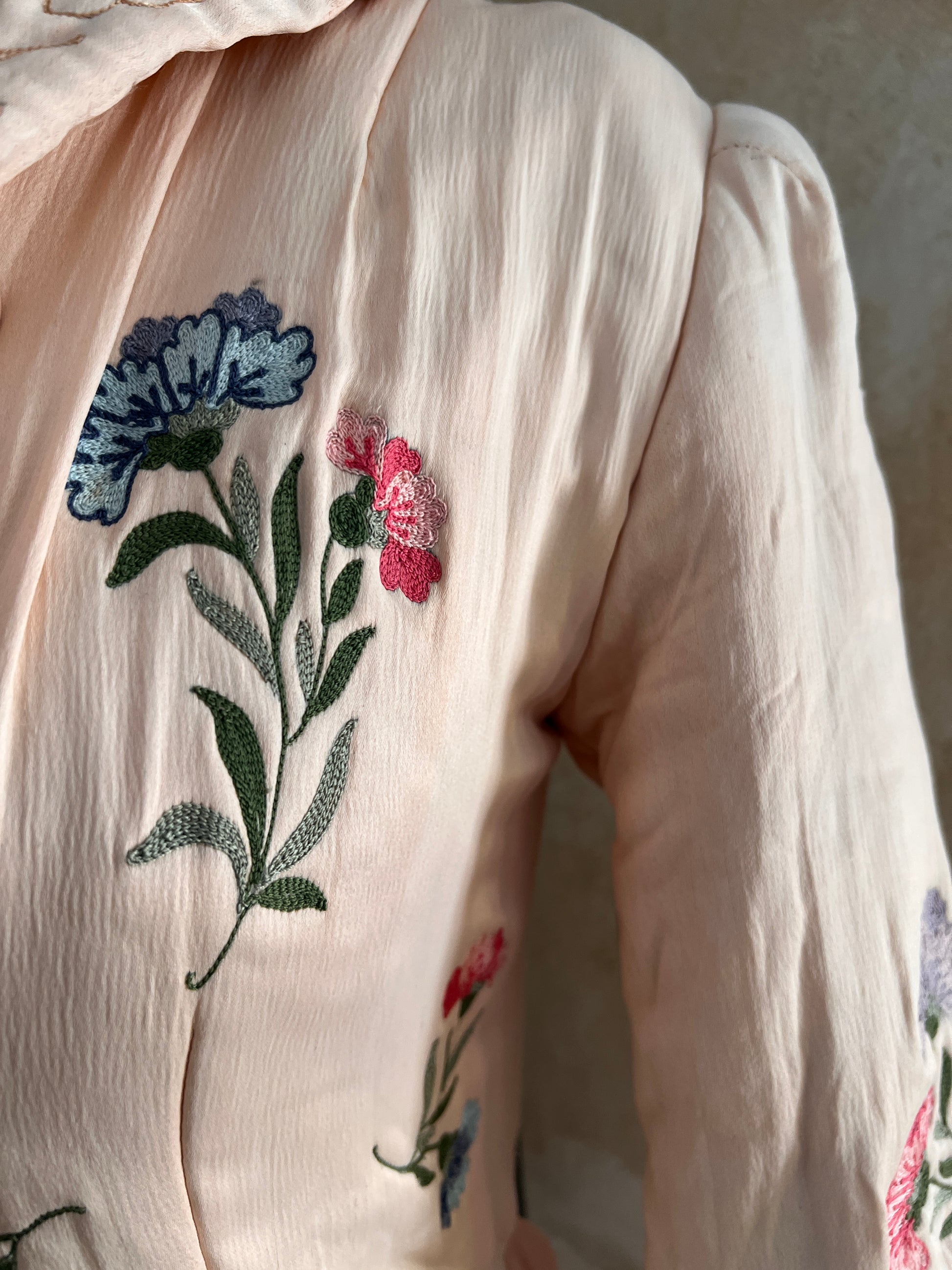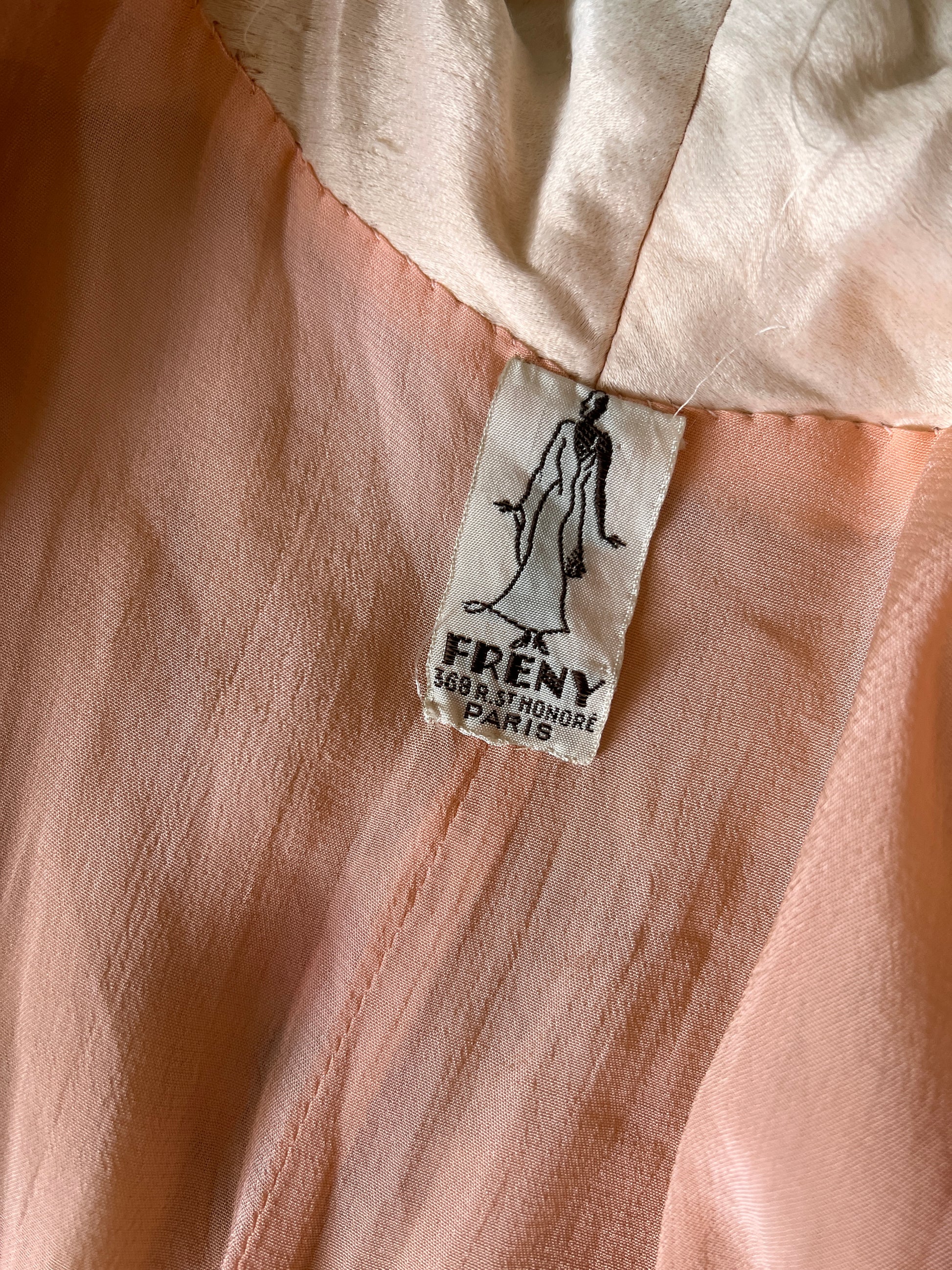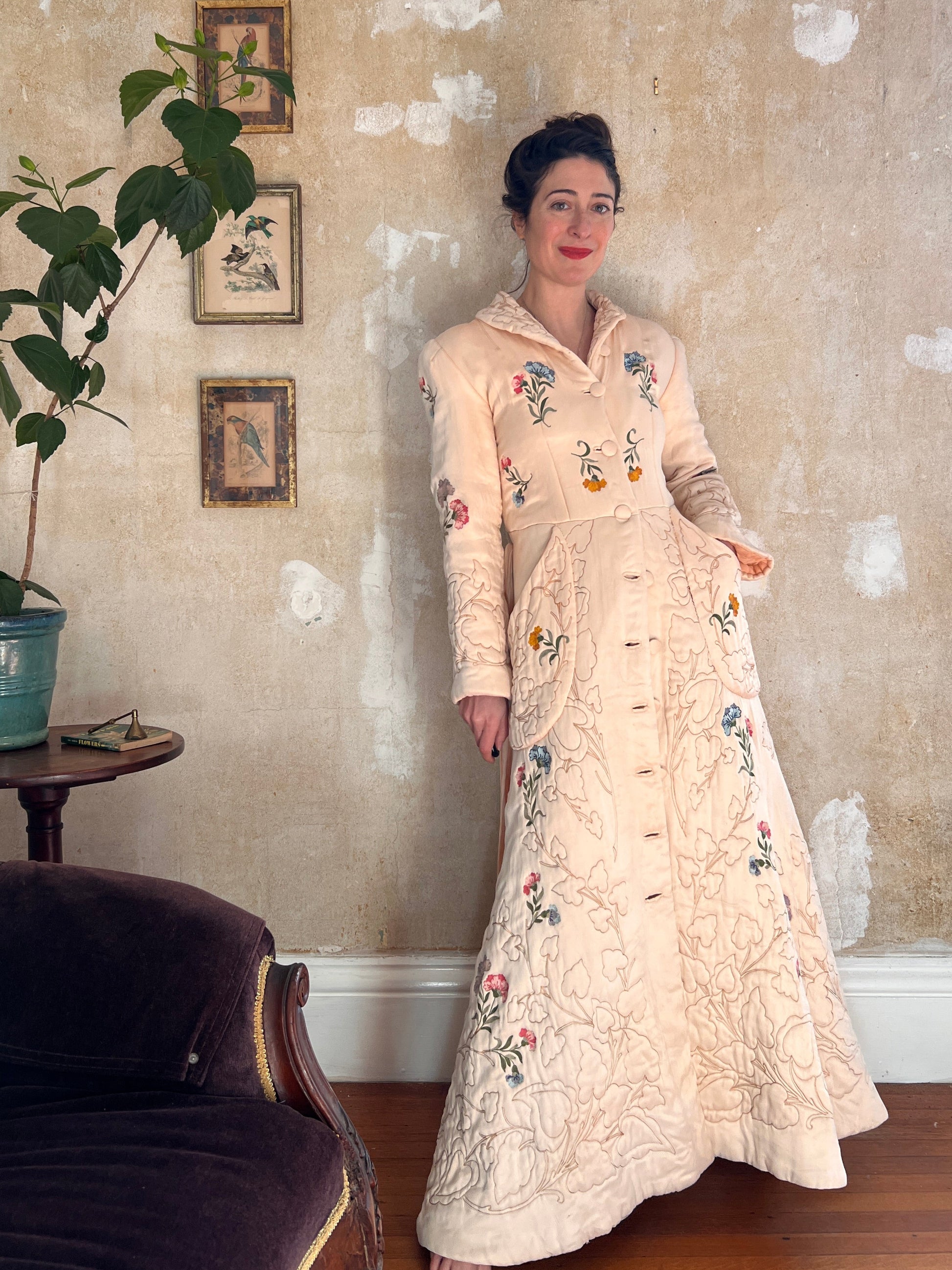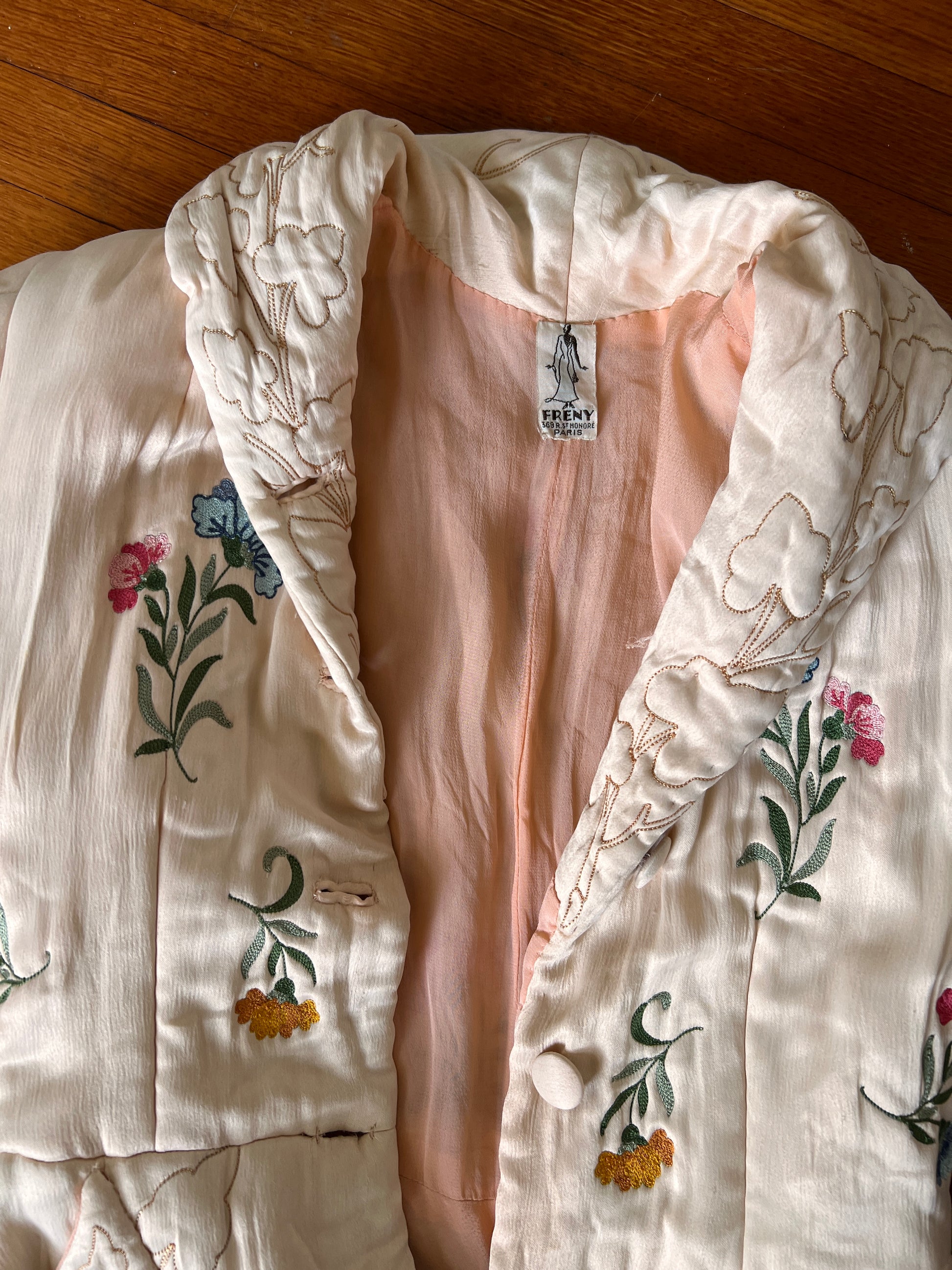 Incredible 1930s/40s pale peach quilted dressing gown/robe with intricate embroidered floral design and a quilted gold thread leaf motif throughout. Fully lined in pink silk, covered buttons up the front, large pockets, cinched waist, padded shoulders and silk sash tie. Very old Hollywood glamour. Would make an excellent bridal getting-ready piece! Made by Freny 368 Rue St Honore Paris