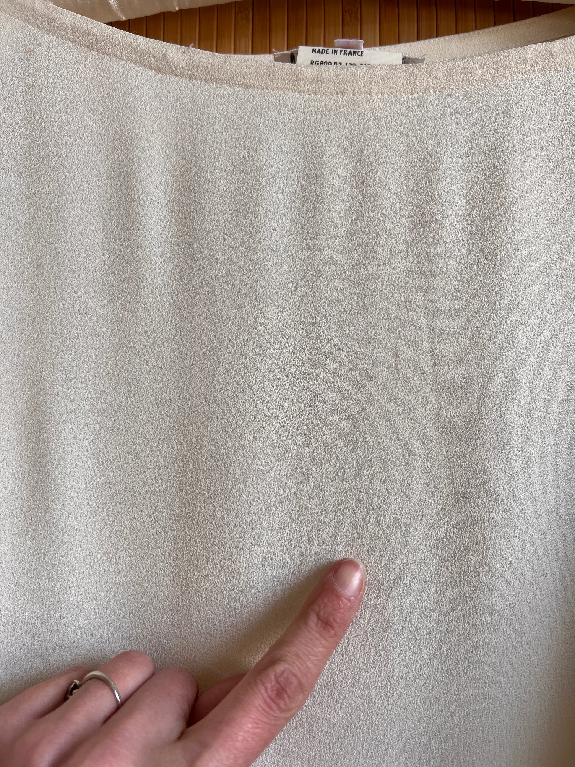 1990s crepe gown by Yves St Laurent Rive Gauche. Simple yet striking, with a lovely sleeve detail that scoops and gathers the wide cut sleeve at the shoulder with buttoned epaulettes. Boat neckline and a streamlined column cut with plenty of allowance at the hem should you wish to shorten. Would make an absolutely lovely wedding gown!